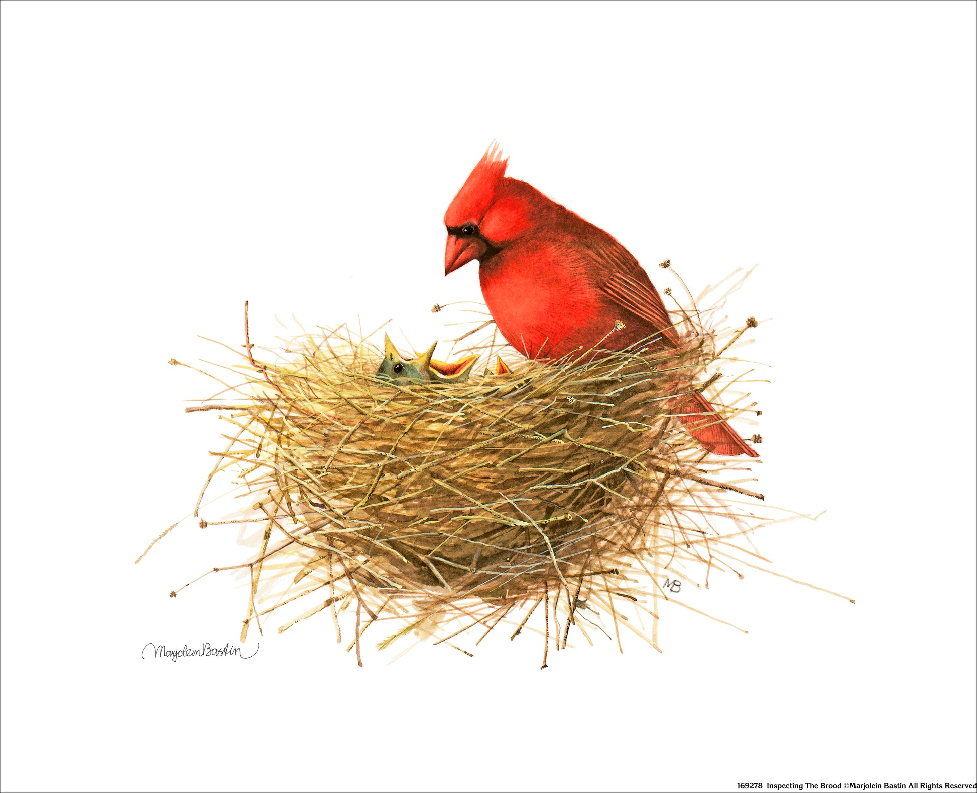 The Northern cardinal has been a busy bird this spring. His impressive song has been a constant reminder of his presence around the house for several months now. The male, dressed in a beautiful bright red coat and festive crest, is inspecting the nestlings that hatched about a week ago. This is their first brood of the year, a second is likely and some cardinals even have three every year!