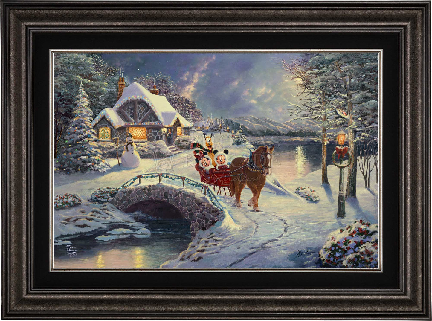 Thomas Kinkade was a life-long admirer of Walt Disney and the wonderful characters he created. In collaboration with Disney, Thomas Kinkade Studios has created the Friendship Moments series, a collection of art featuring favorite characters and their best friends painted in beautiful Kinkade settings. One can almost feel the cool wintery breeze blowing across the smiling faces of Mickey, Minnie and Pluto as they enjoy their evening winter sleigh ride. The snow muffles the sounds of their horse’s hooves, as it drawMickey and Minnie Evening Sleigh Rides the sleigh over the stone bridge. The Christmas trees twinkle against the evening sky and the holly berry bushes bloom a vibrant red along their snowy path. This is a most wondrous time for Mickey and Minnie as the Christmas season is almost upon them. Are they off on a winter adventure, or are they on the way to the nearby village to shop for family and friends? Thomas Kinkade Studios invites you to join in on the Holiday fun in Disney Mickey and Minnie Evening Sleigh Ride.