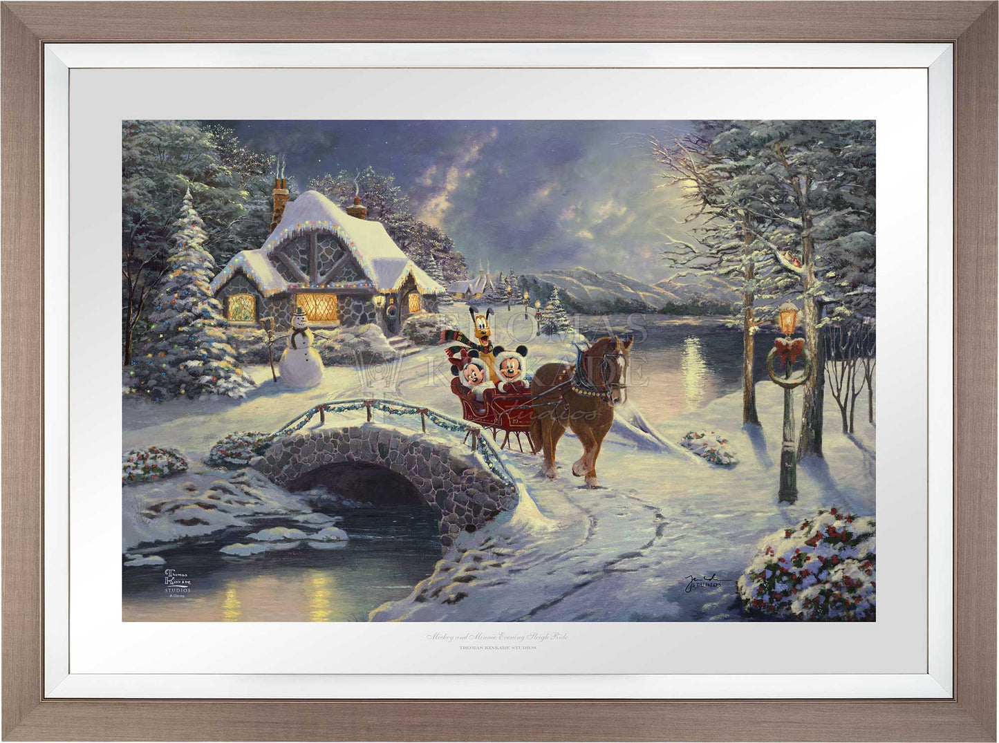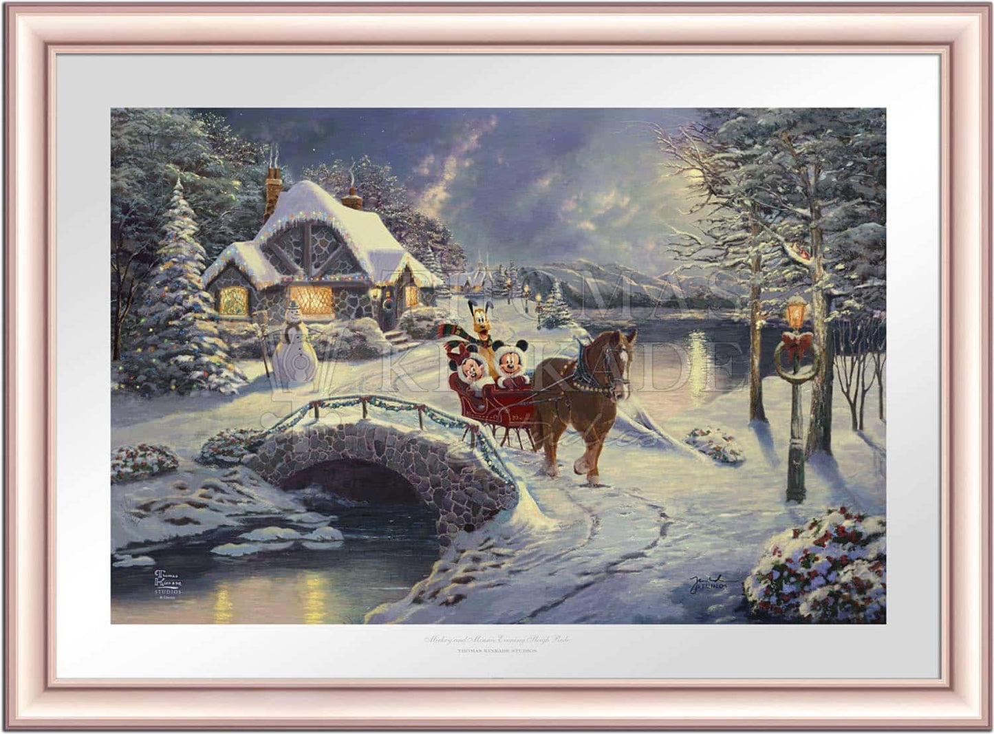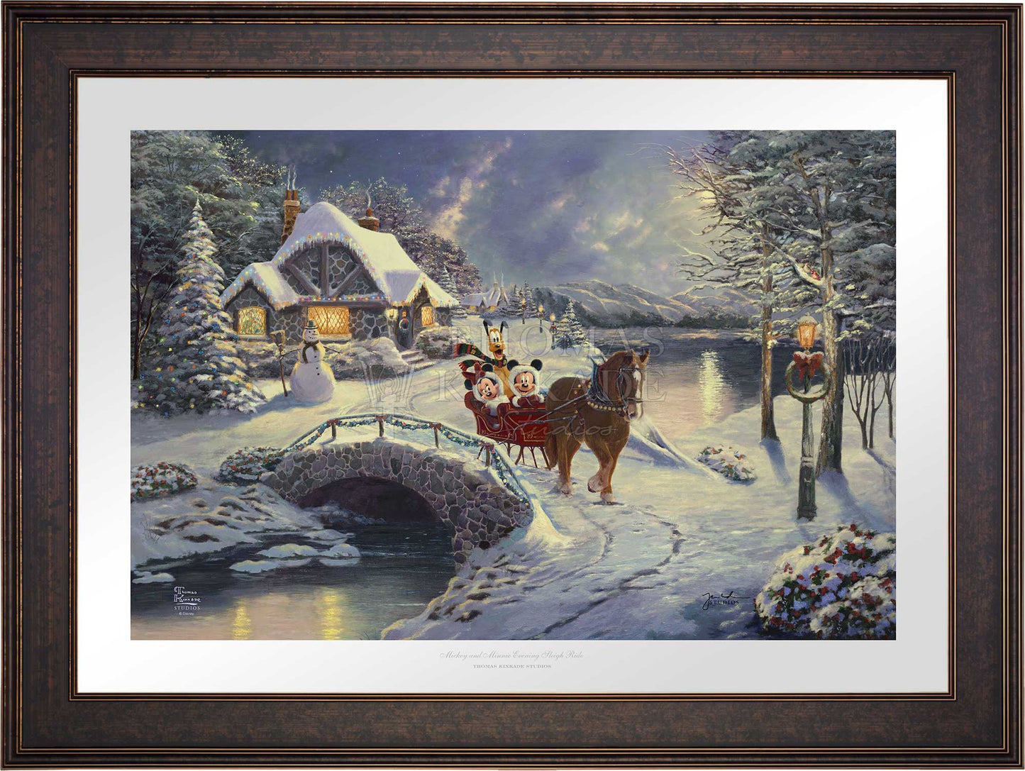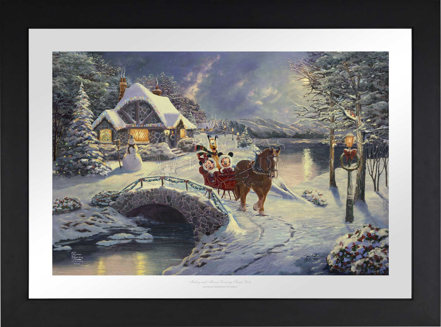 This is a most wondrous time for Mickey and Minnie as the Christmas season is almost upon them. Are they off on a winter adventure, or are they on the way to the nearby village to shop for family and friends? Thomas Kinkade Studios invites you to join in on the Holiday fun in Disney Mickey and Minnie Evening Sleigh Ride.