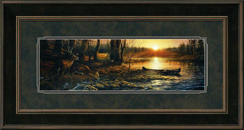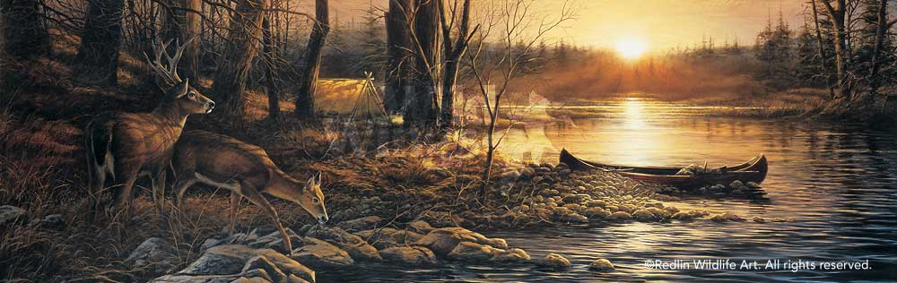 “The rising sun has just topped the distant tree line revealing a camper’s tent and canoe. A whitetail buck and doe appear from the forest depth and cautiously approach the water’s edge. The beginning of a new day has been signaled, and the tranquil mood suggests that in this corner of our world, man and nature live in harmony.”
