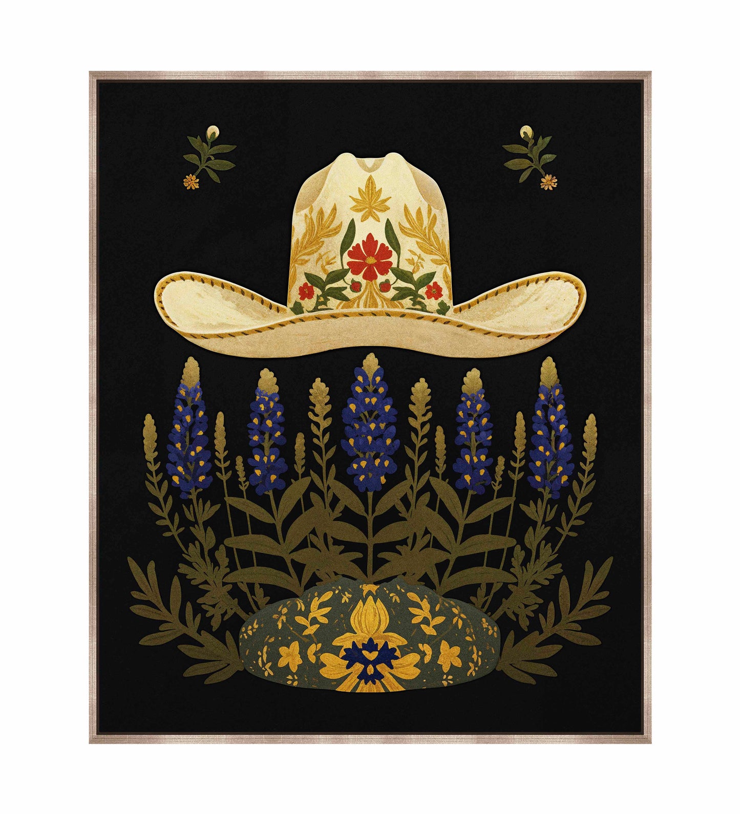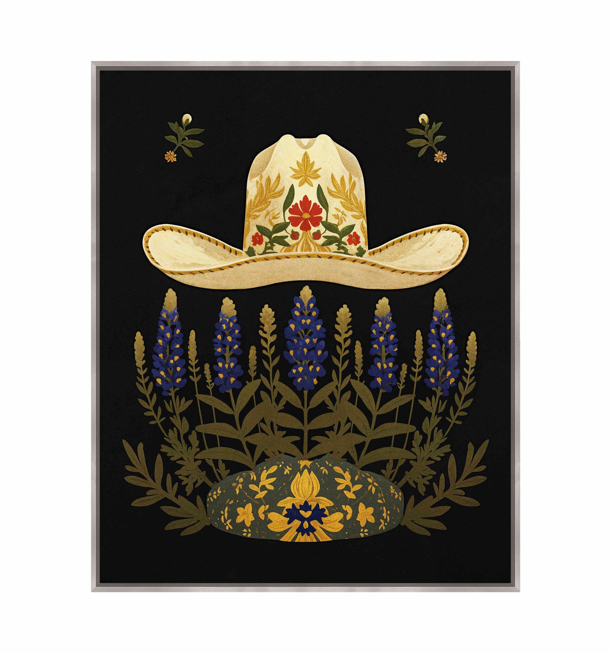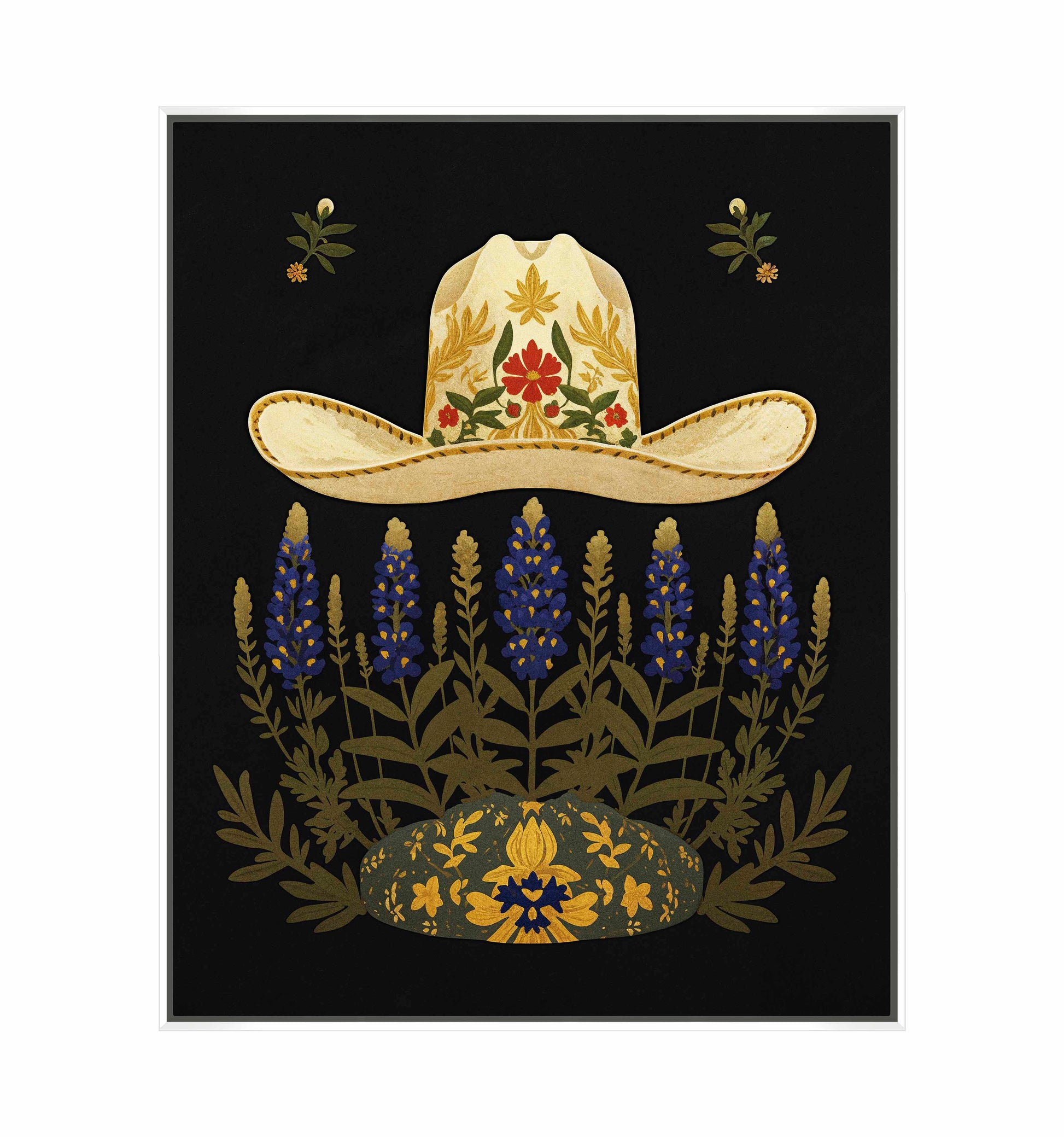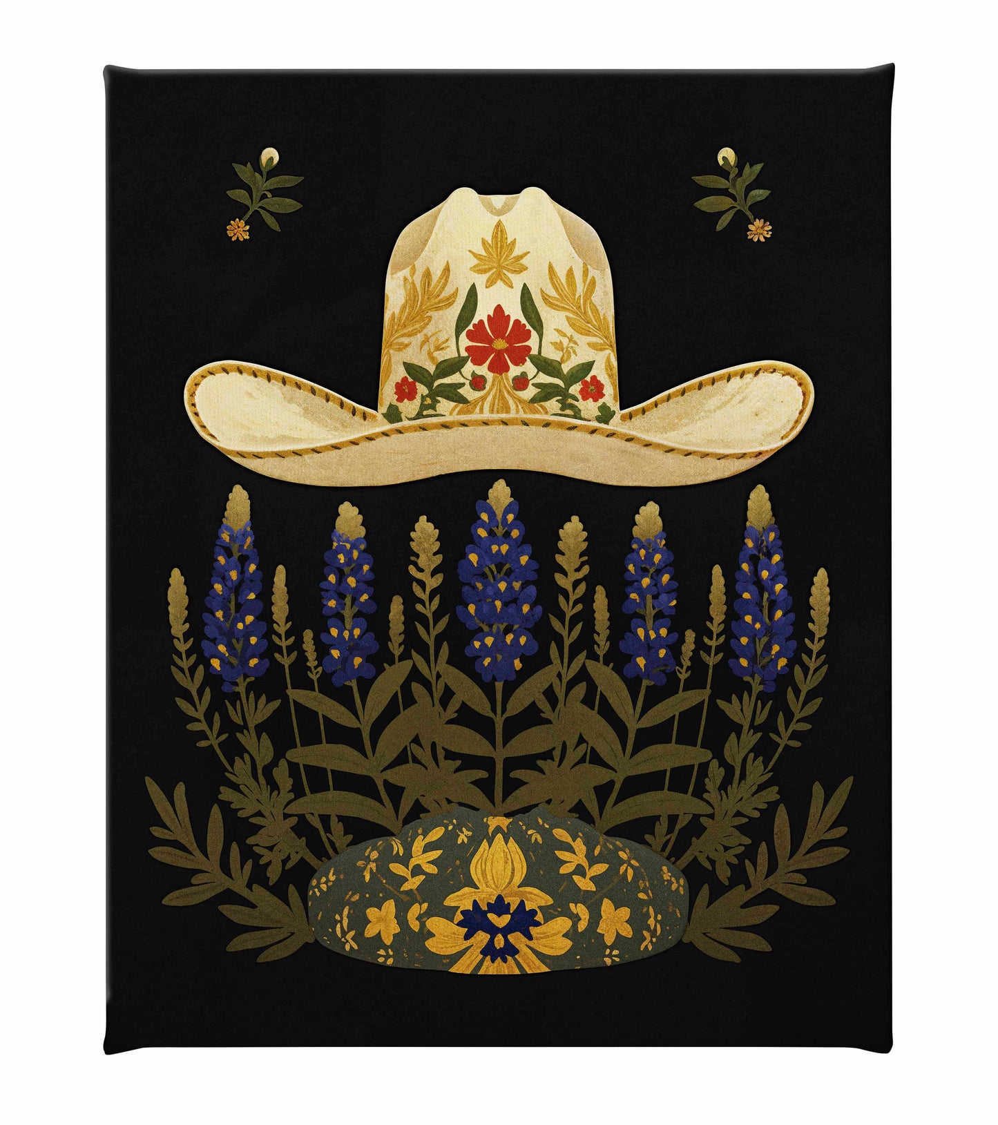 Beneath the hat, a cluster of bluebonnets—Texas's state flower—stands tall, adding a sense of depth and natural beauty to the composition. The bluebonnets are meticulously detailed, with deep blue and gold accents that contrast vividly against the dark backdrop. Additionally, at the base of the bluebonnets, a decorated stone or badge features a similar floral motif, tying the elements of the painting together with a cohesive visual theme.