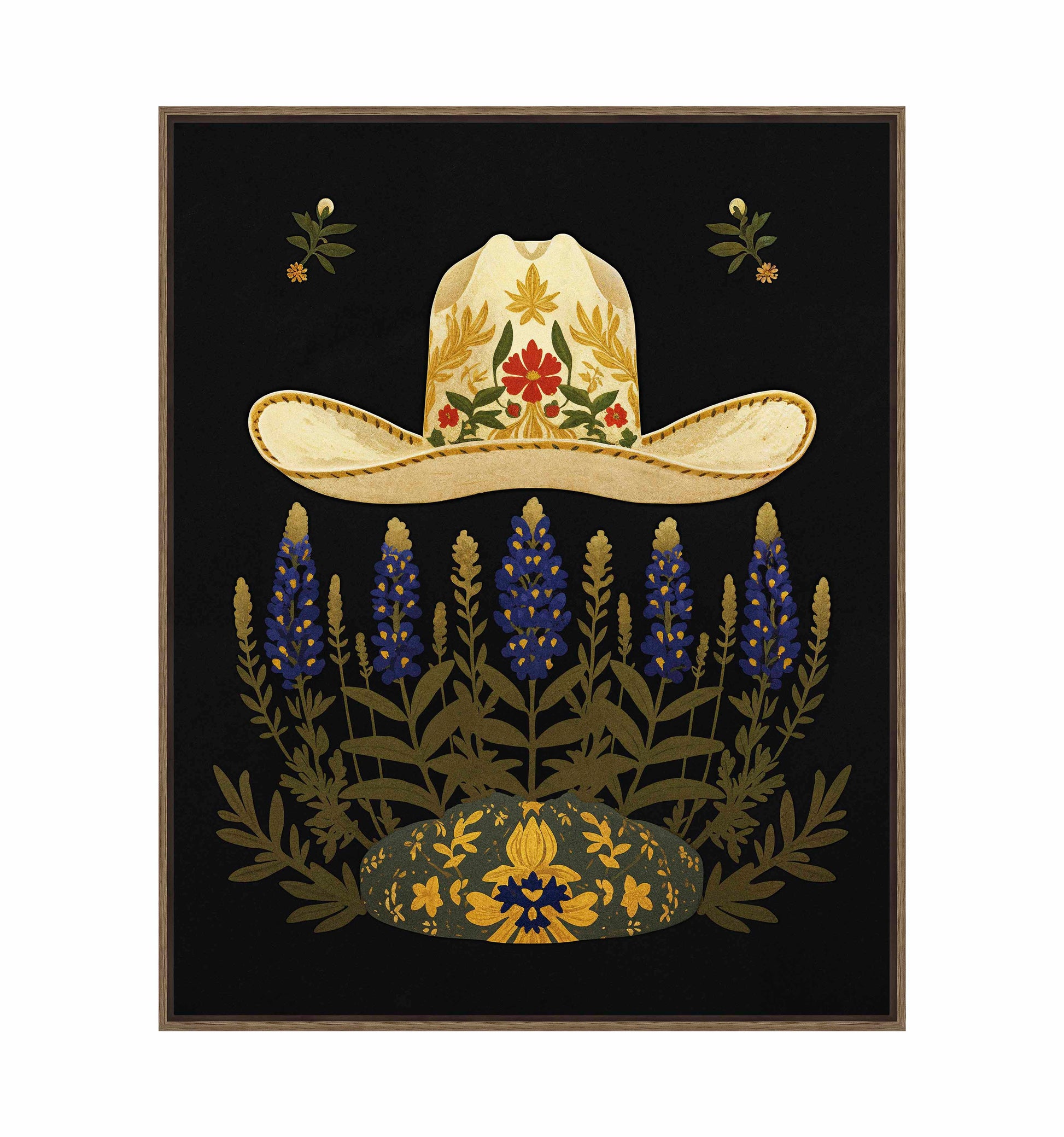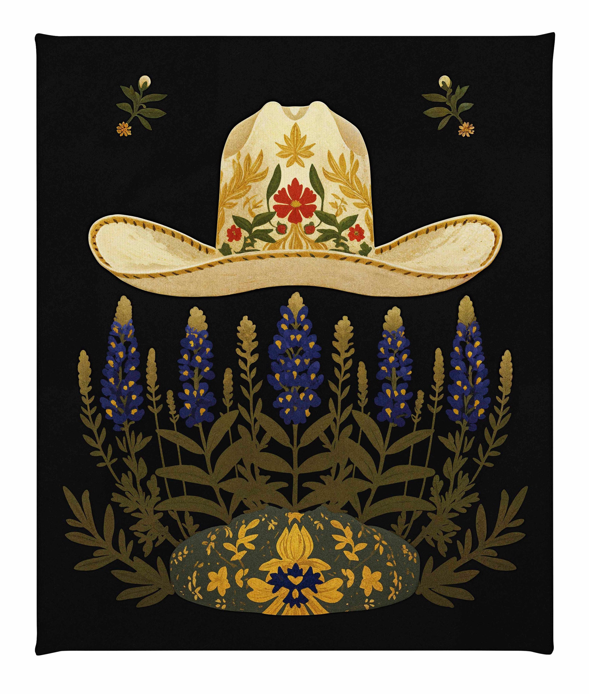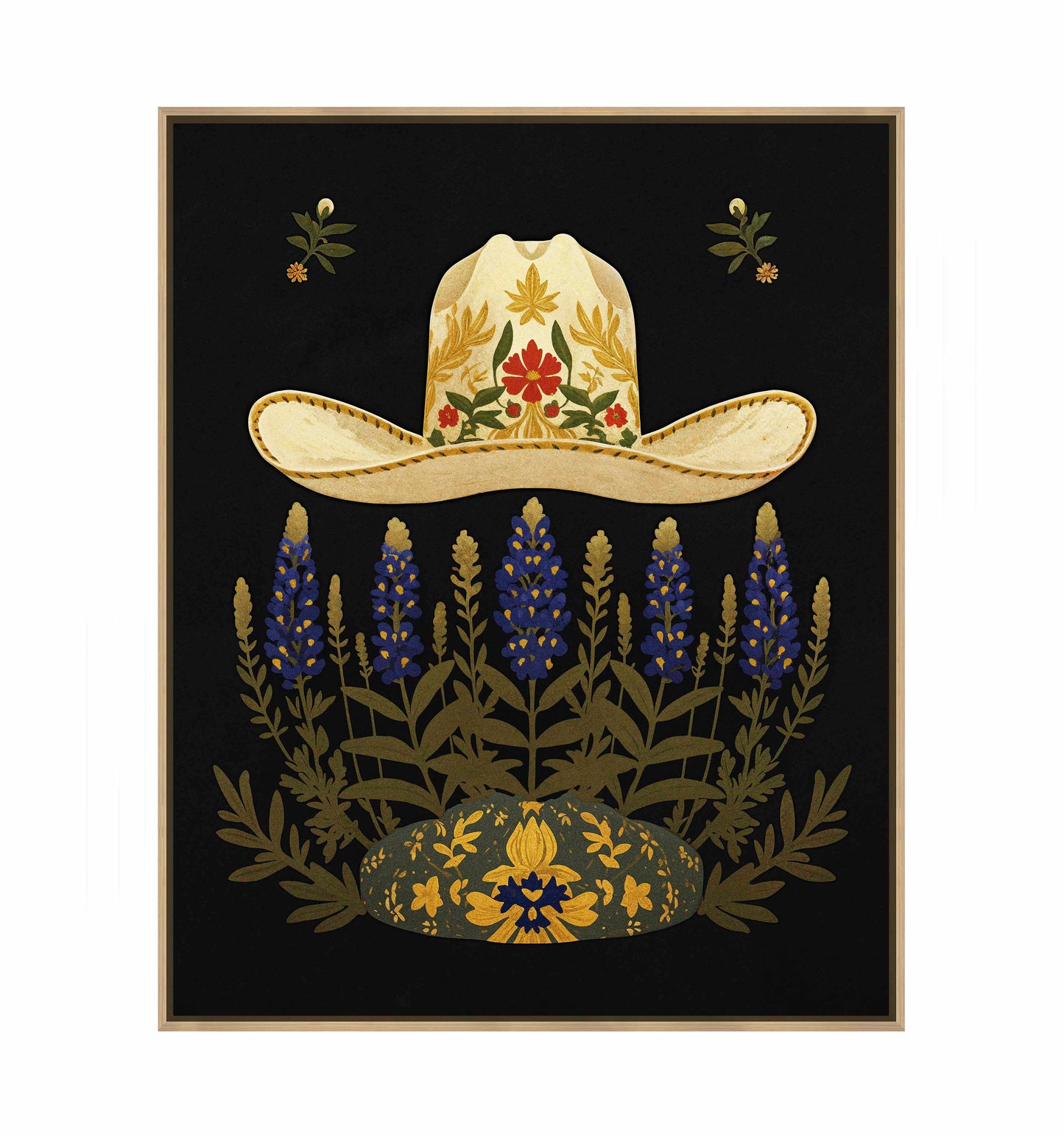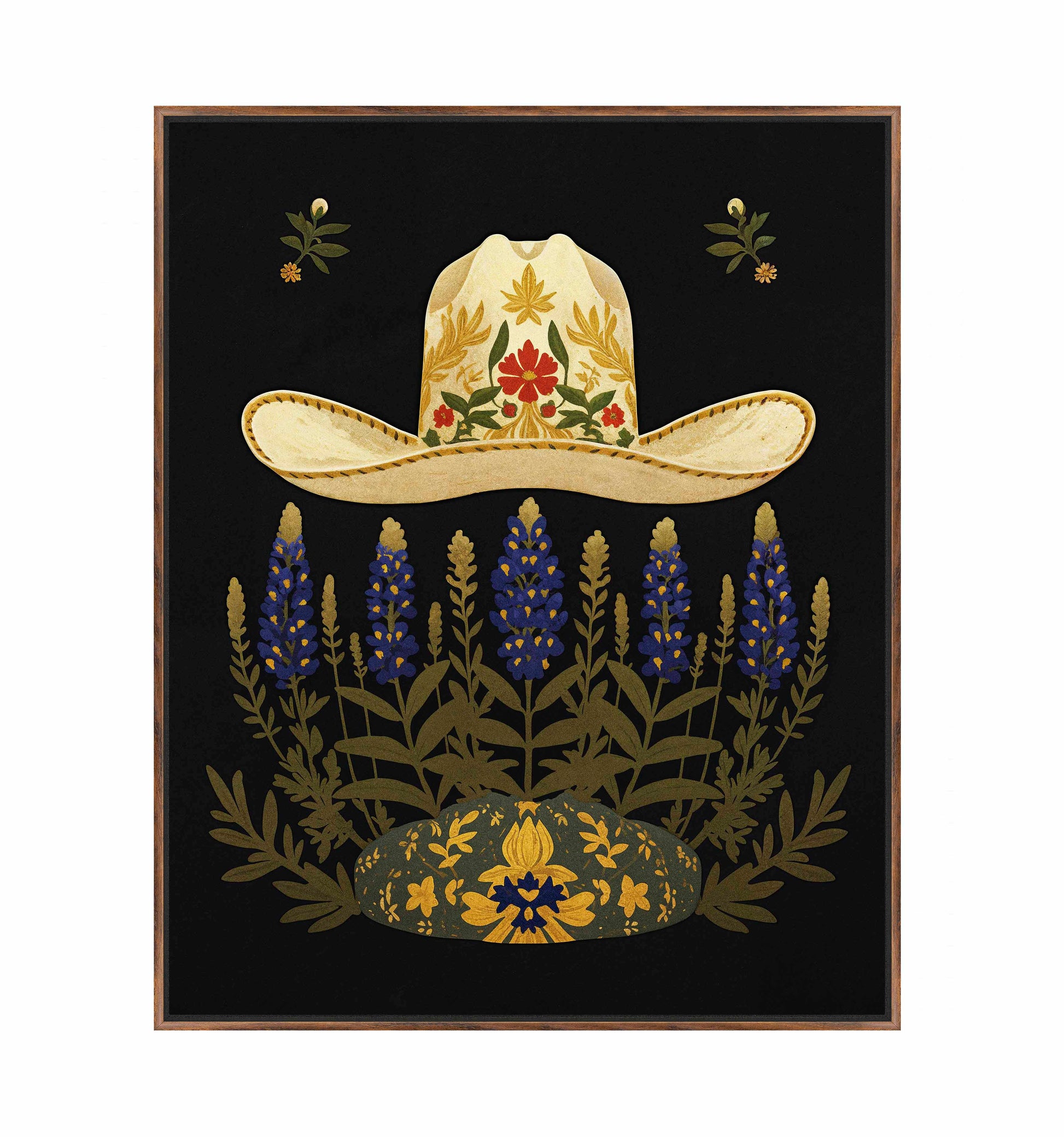 Beneath the hat, a cluster of bluebonnets—Texas's state flower—stands tall, adding a sense of depth and natural beauty to the composition. The bluebonnets are meticulously detailed, with deep blue and gold accents that contrast vividly against the dark backdrop. Additionally, at the base of the bluebonnets, a decorated stone or badge features a similar floral motif, tying the elements of the painting together with a cohesive visual theme.