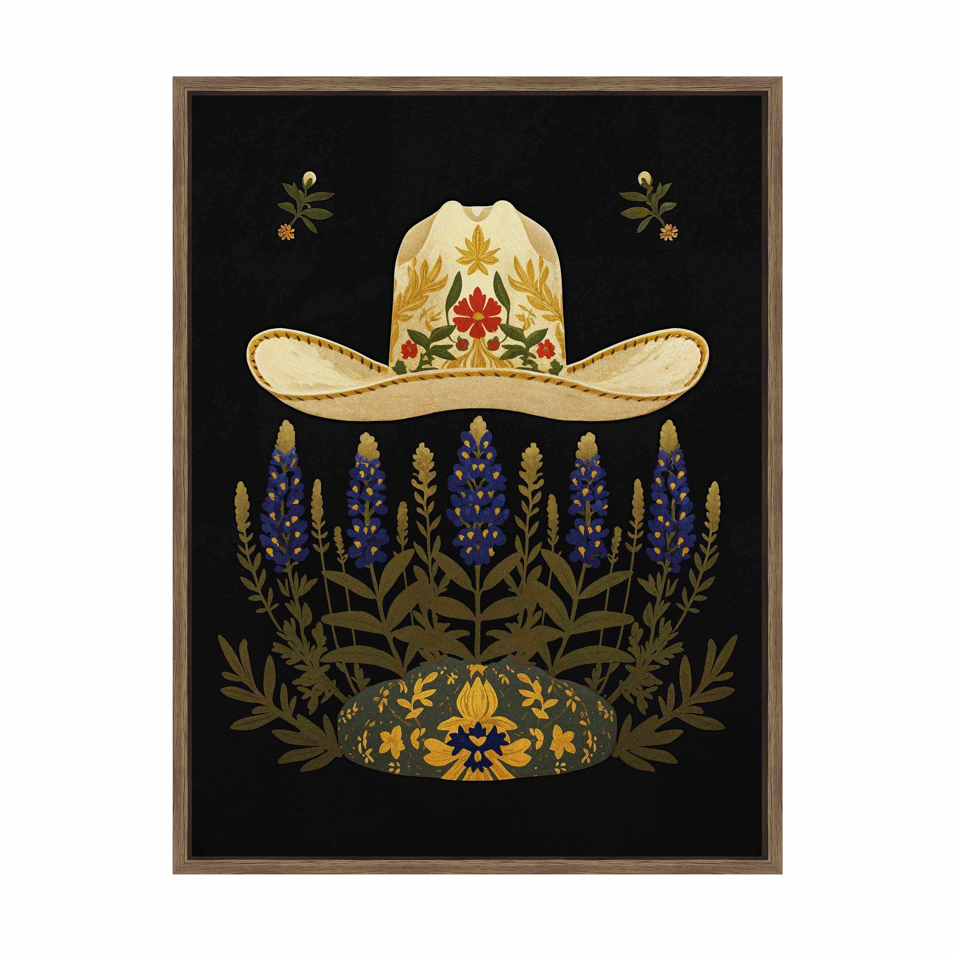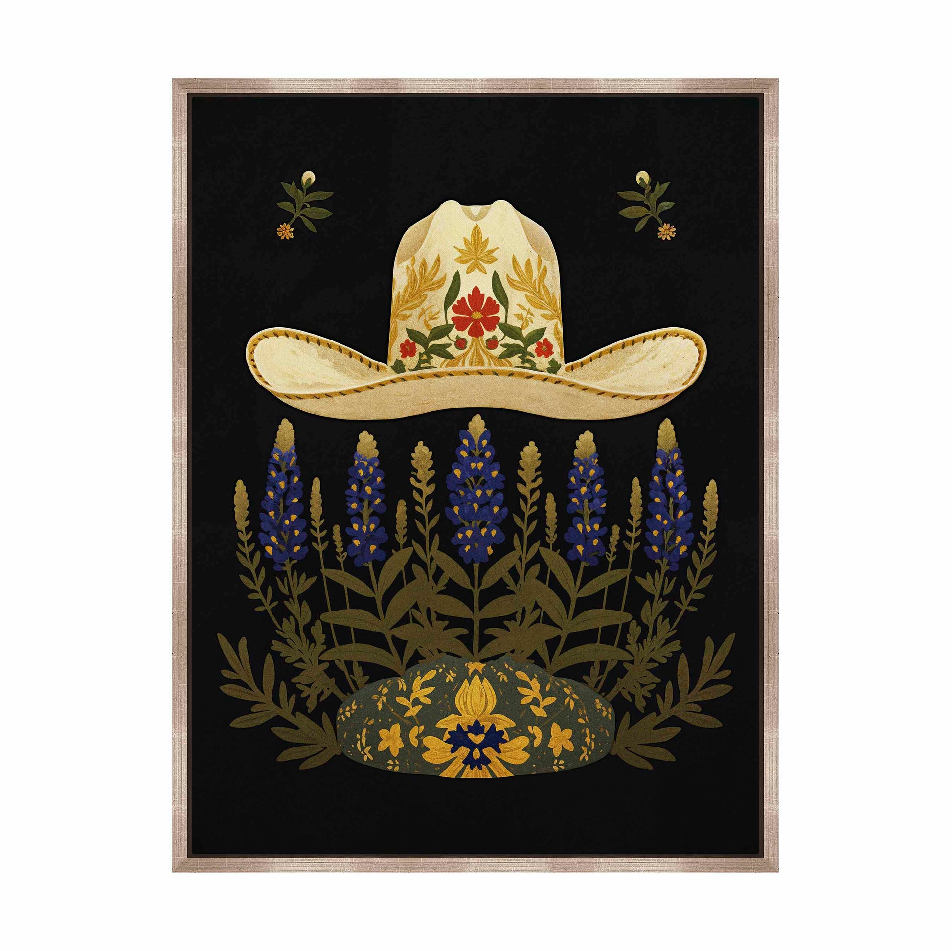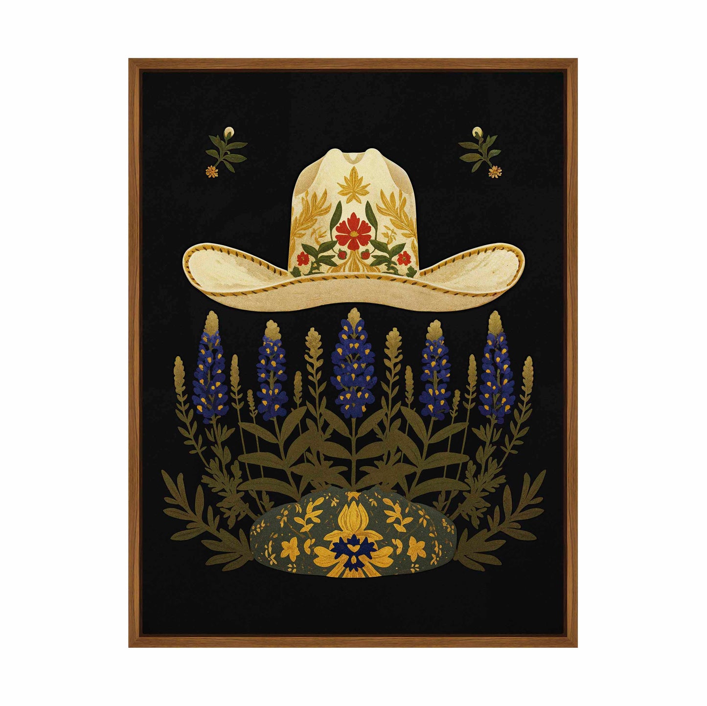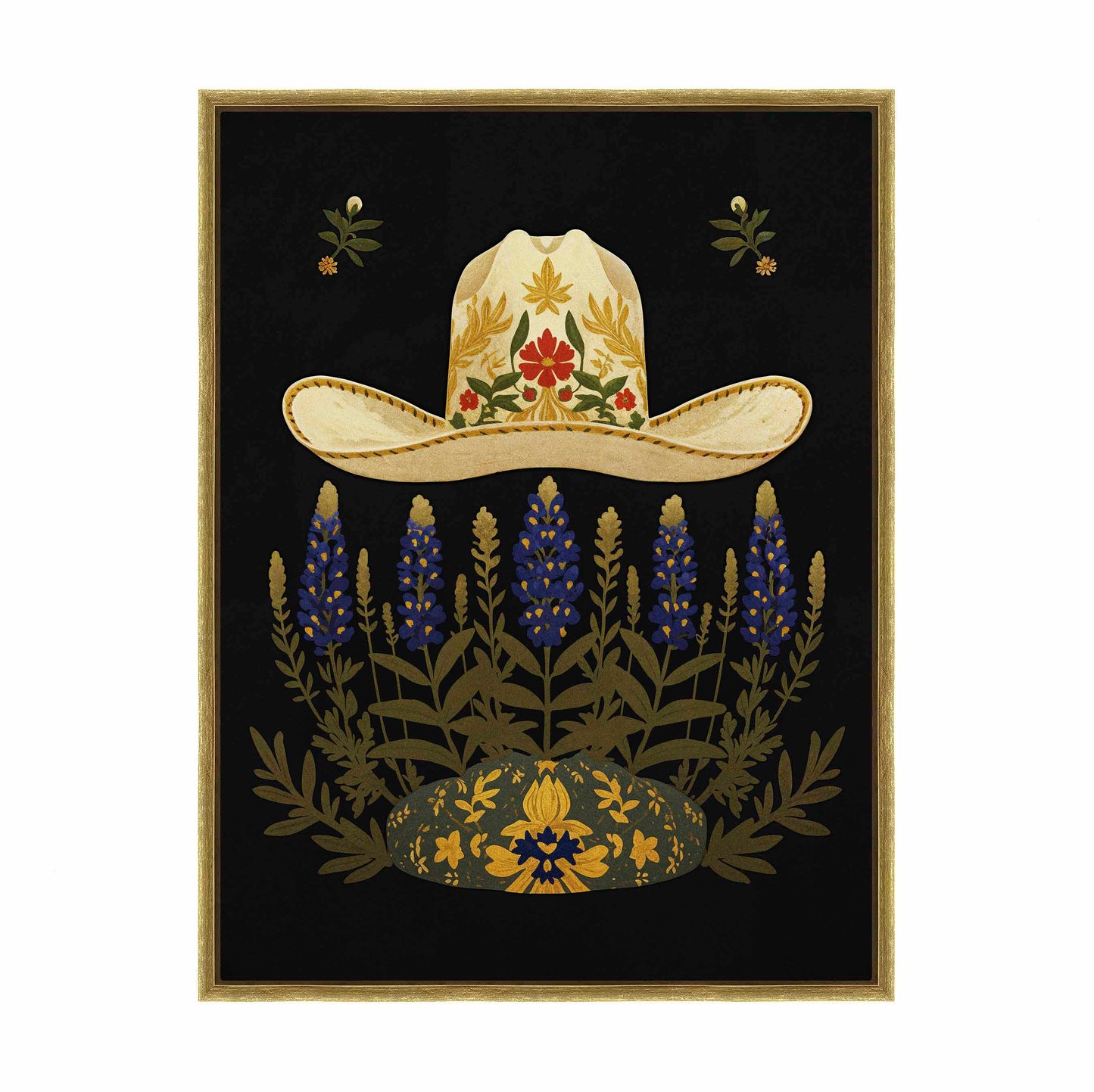 Beneath the hat, a cluster of bluebonnets—Texas's state flower—stands tall, adding a sense of depth and natural beauty to the composition. The bluebonnets are meticulously detailed, with deep blue and gold accents that contrast vividly against the dark backdrop. Additionally, at the base of the bluebonnets, a decorated stone or badge features a similar floral motif, tying the elements of the painting together with a cohesive visual theme.