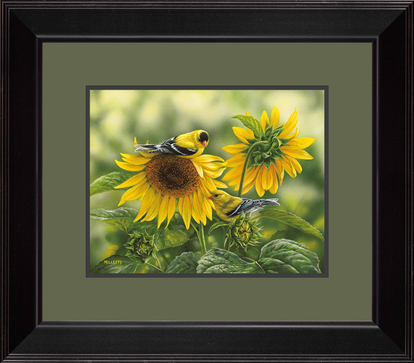 Signature edition art print made from the original acrylic painting. Image size, 11" x 14". Framed size 22" x 25" with a 2-1/2" black moulding. Double matting with dill outer mat. Published exclusively by Wild Wings.