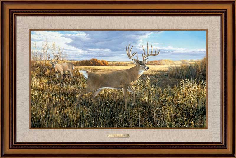Limited edition of 9,500 signed and numbered art prints from the original painting. Image size, 15" x 27". Framed size, 26" x 37-3/4" with 2-3/8" espresso walnut-finished moulding. Double matting with Sabbia (sand) outer mat with mat cut around remarque. Published exclusively by Wild Wings.