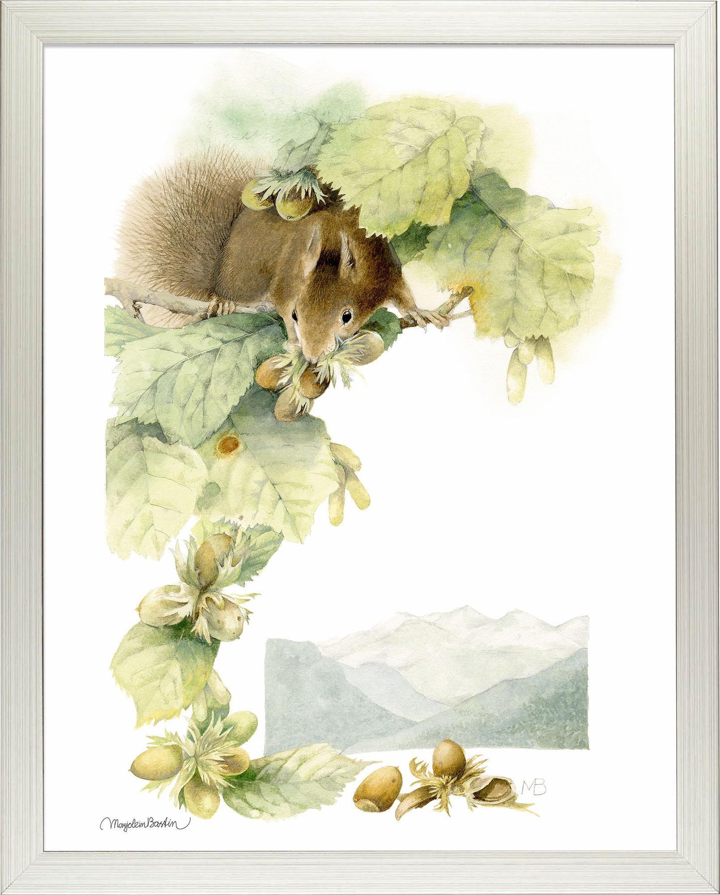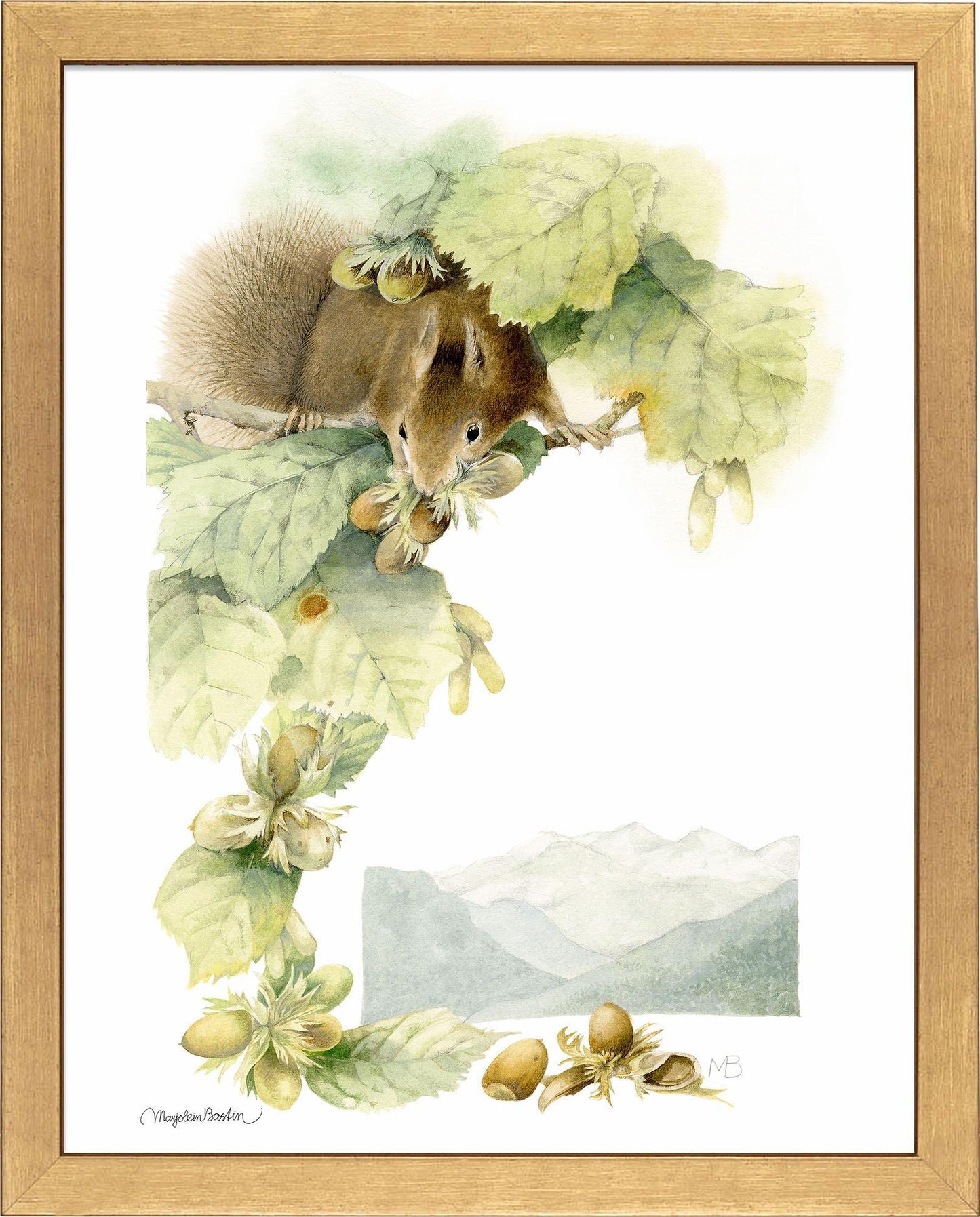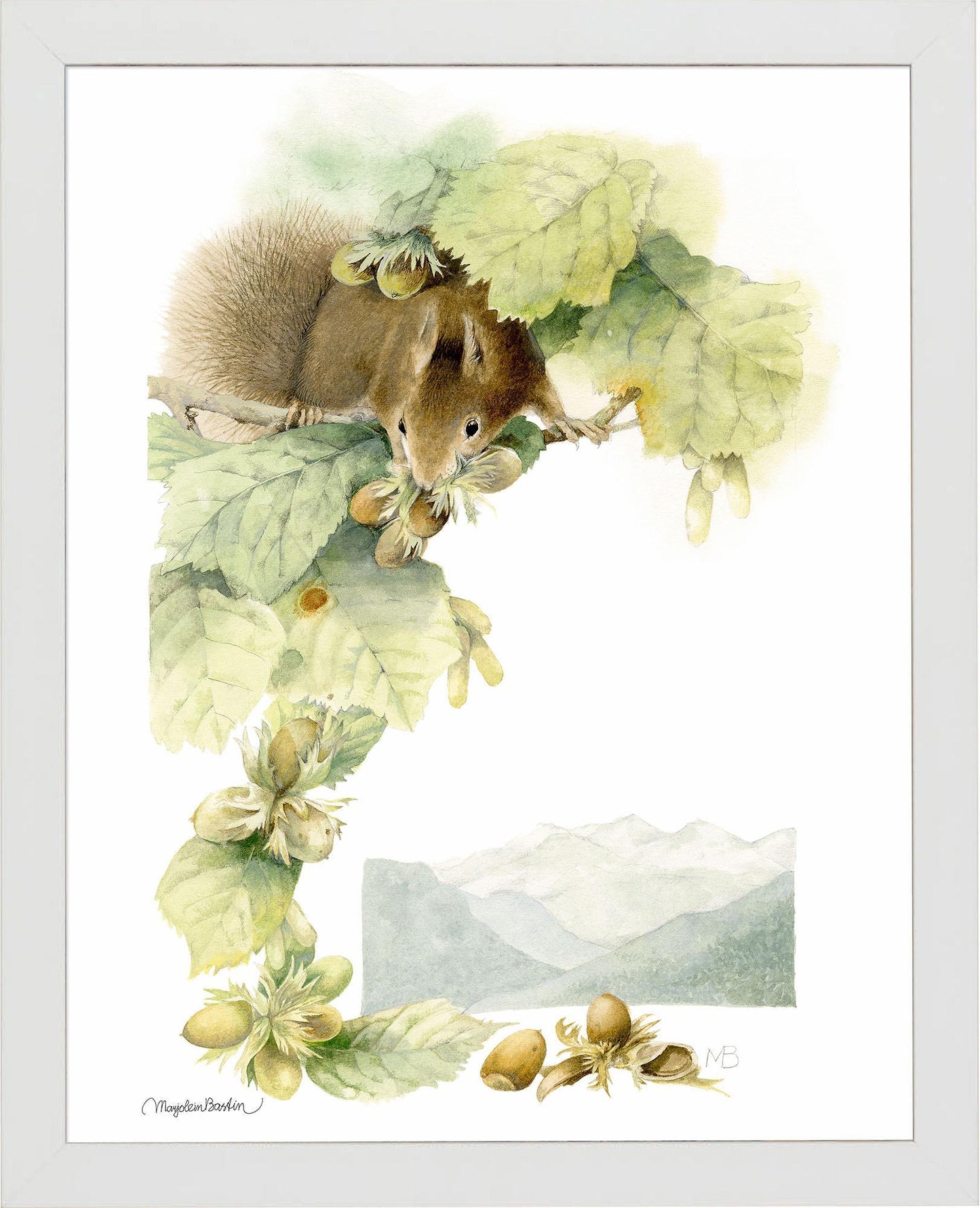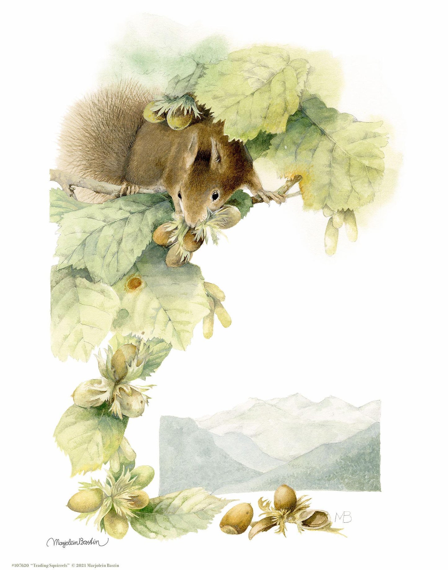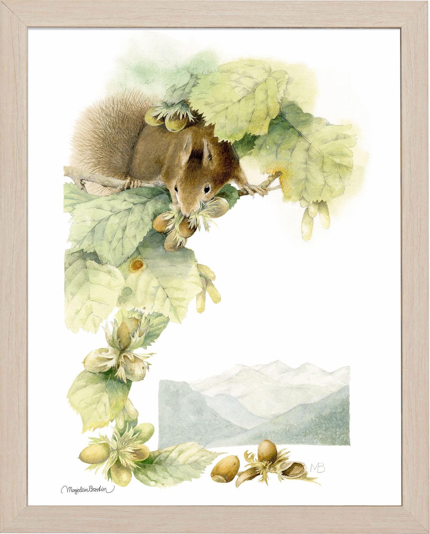 Open edition of art prints featuring a squirrel looking for acorns. Choose framed or unframed. Published exclusively by Wild Wings. Print size is 11"W x 14"H. Framed size is 13"W x 16"H.