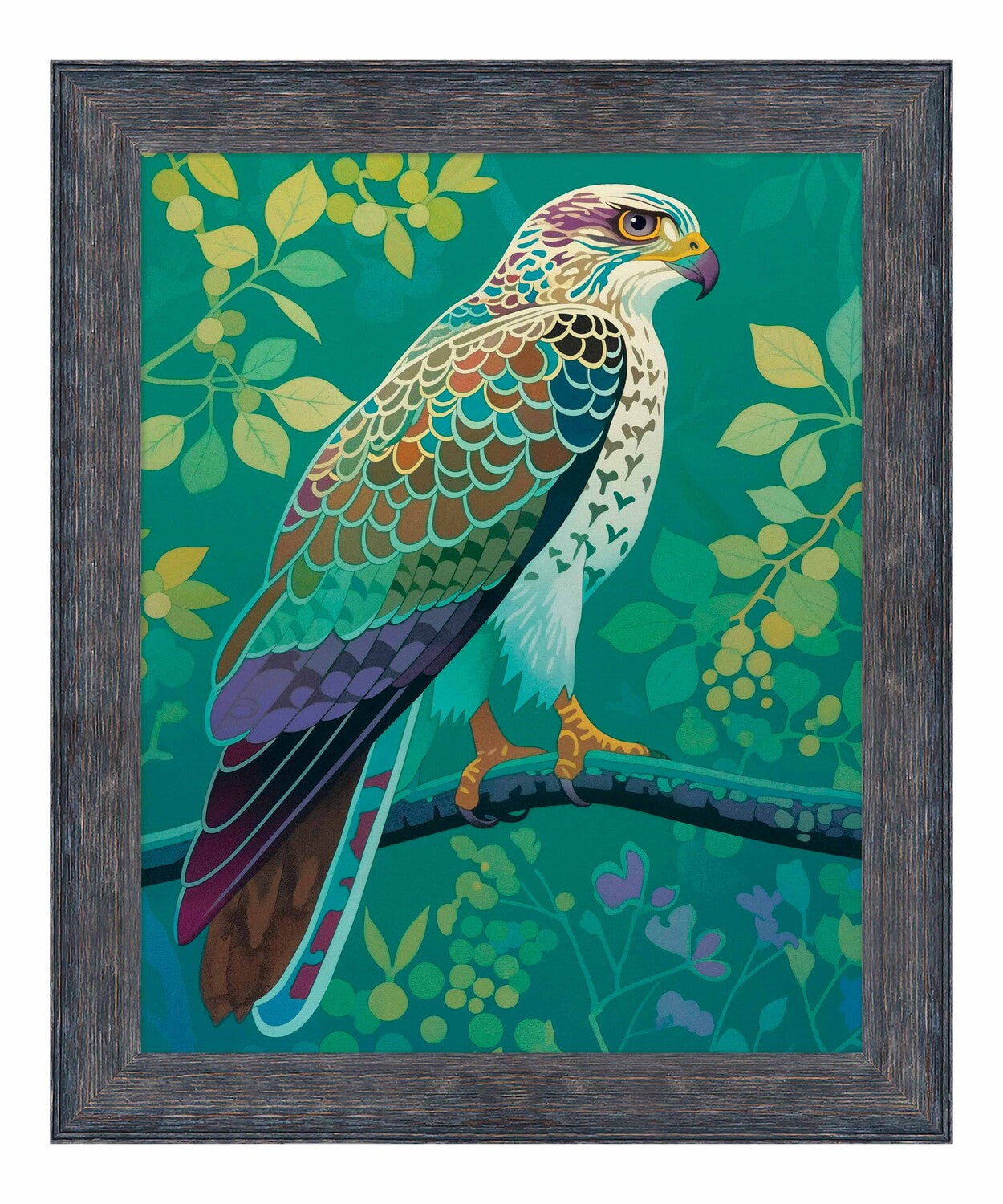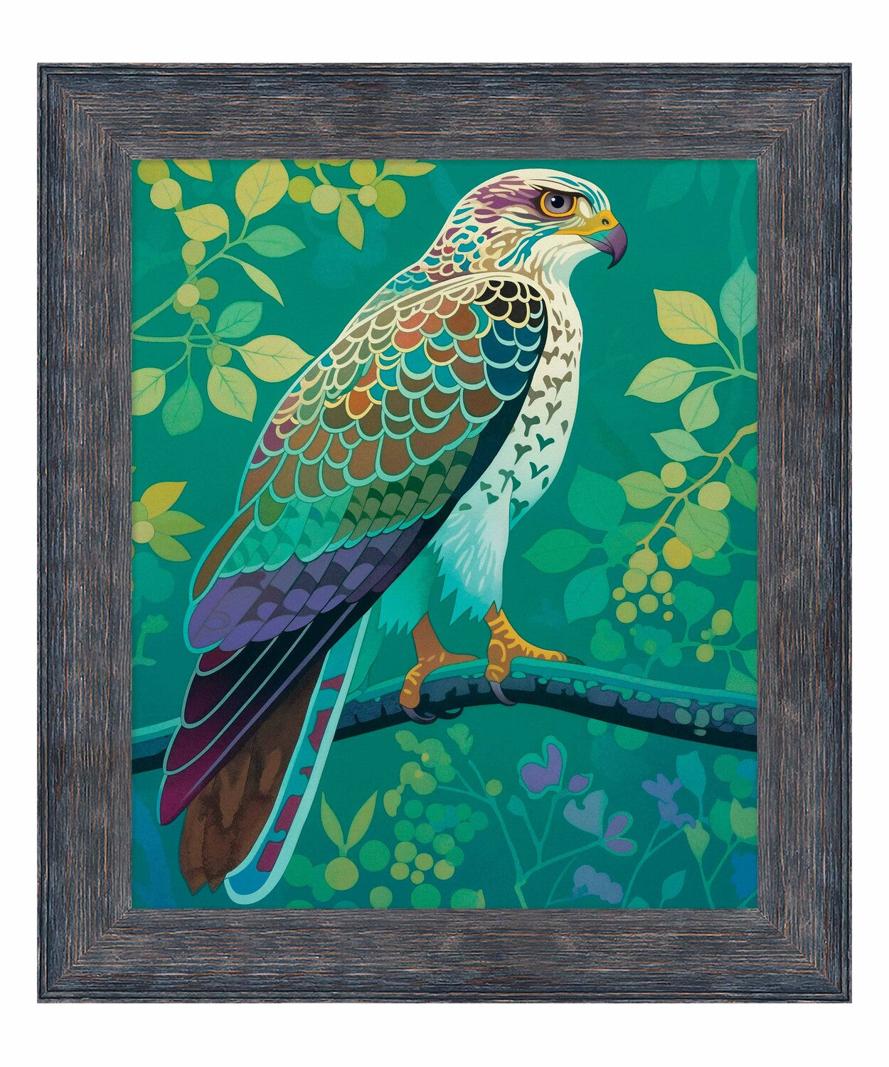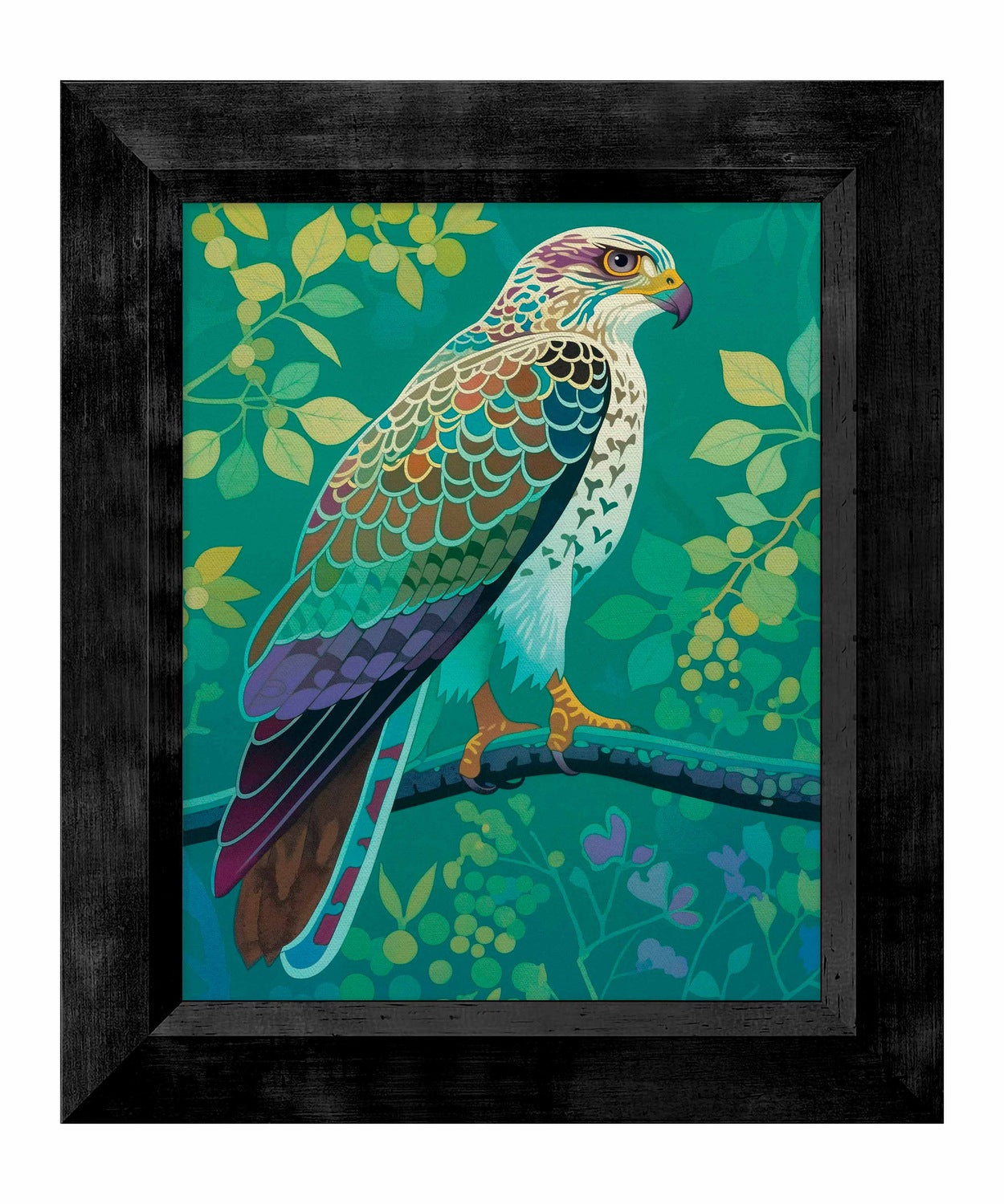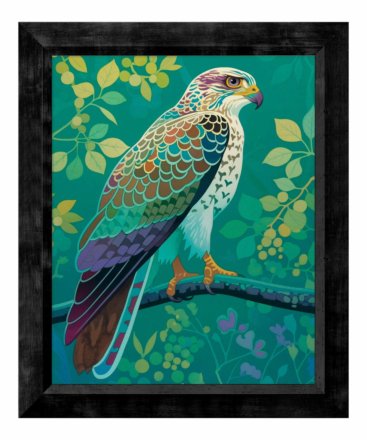 The artist's use of a rich, saturated color palette creates a sense of depth within the foliage. The contrasting hues and intricate patterns draw the viewer's eye, making the hawk the undeniable focal point of the composition. The lush background, with its varied shades of green and hints of yellow and purple, adds to the overall sense of vibrancy and natural beauty.