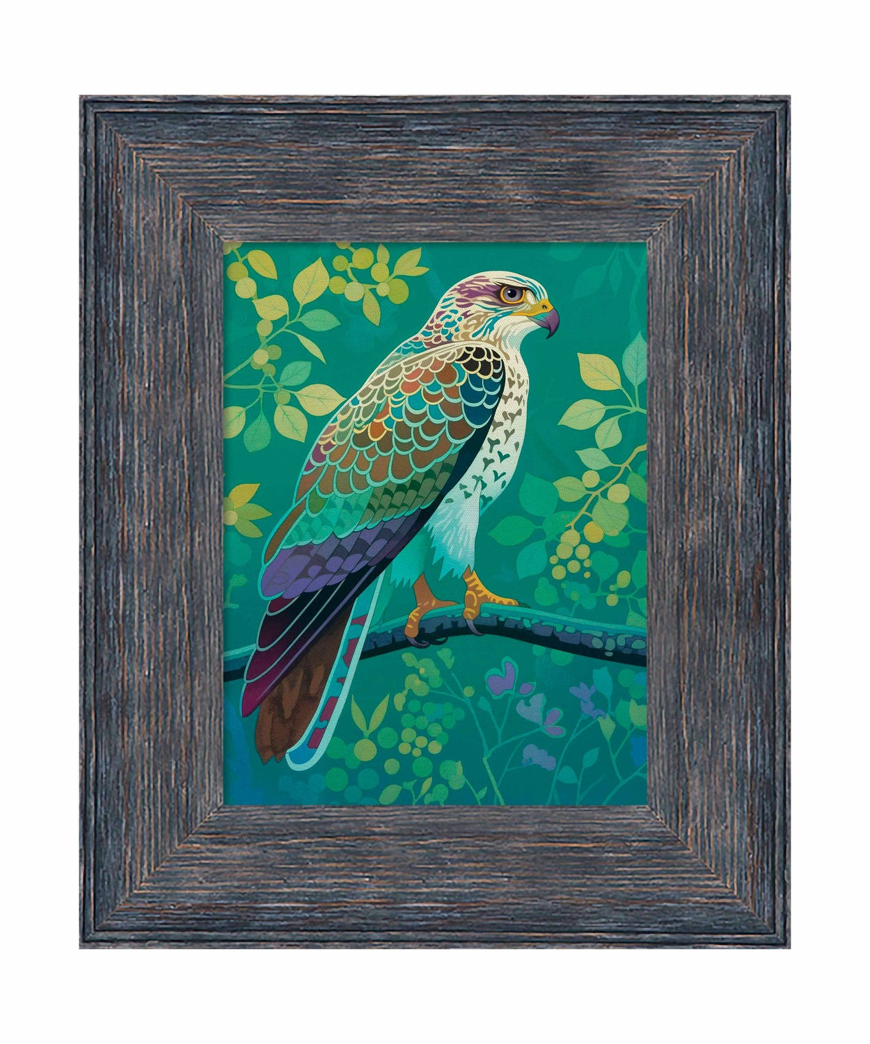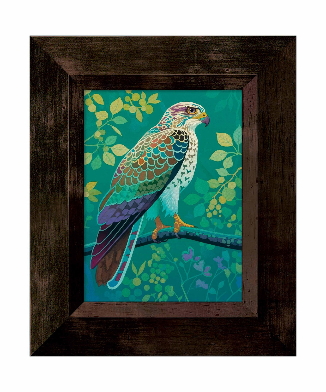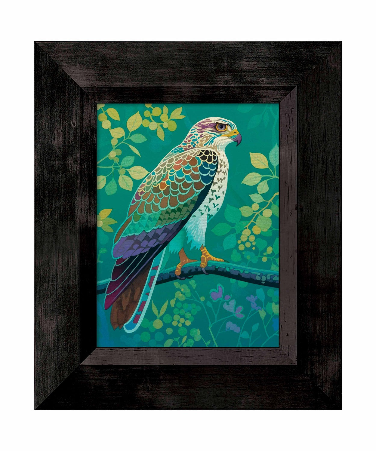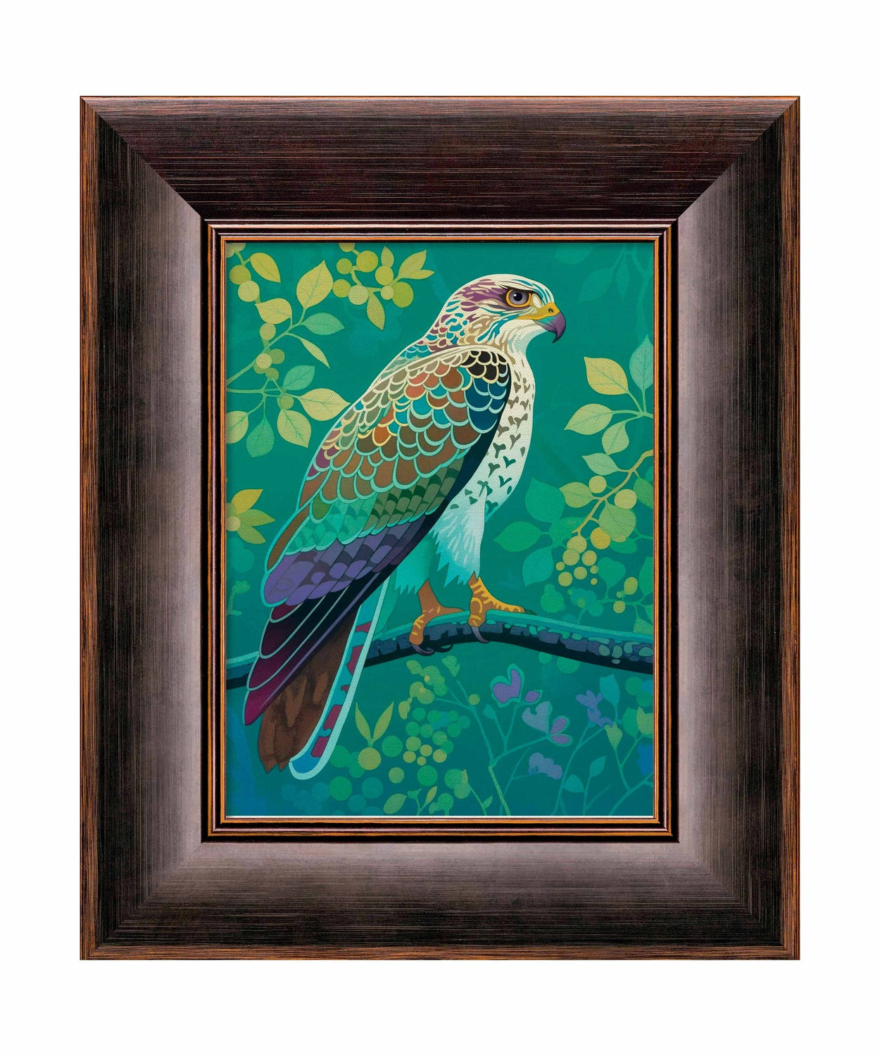 The artist's use of a rich, saturated color palette creates a sense of depth within the foliage. The contrasting hues and intricate patterns draw the viewer's eye, making the hawk the undeniable focal point of the composition. The lush background, with its varied shades of green and hints of yellow and purple, adds to the overall sense of vibrancy and natural beauty.