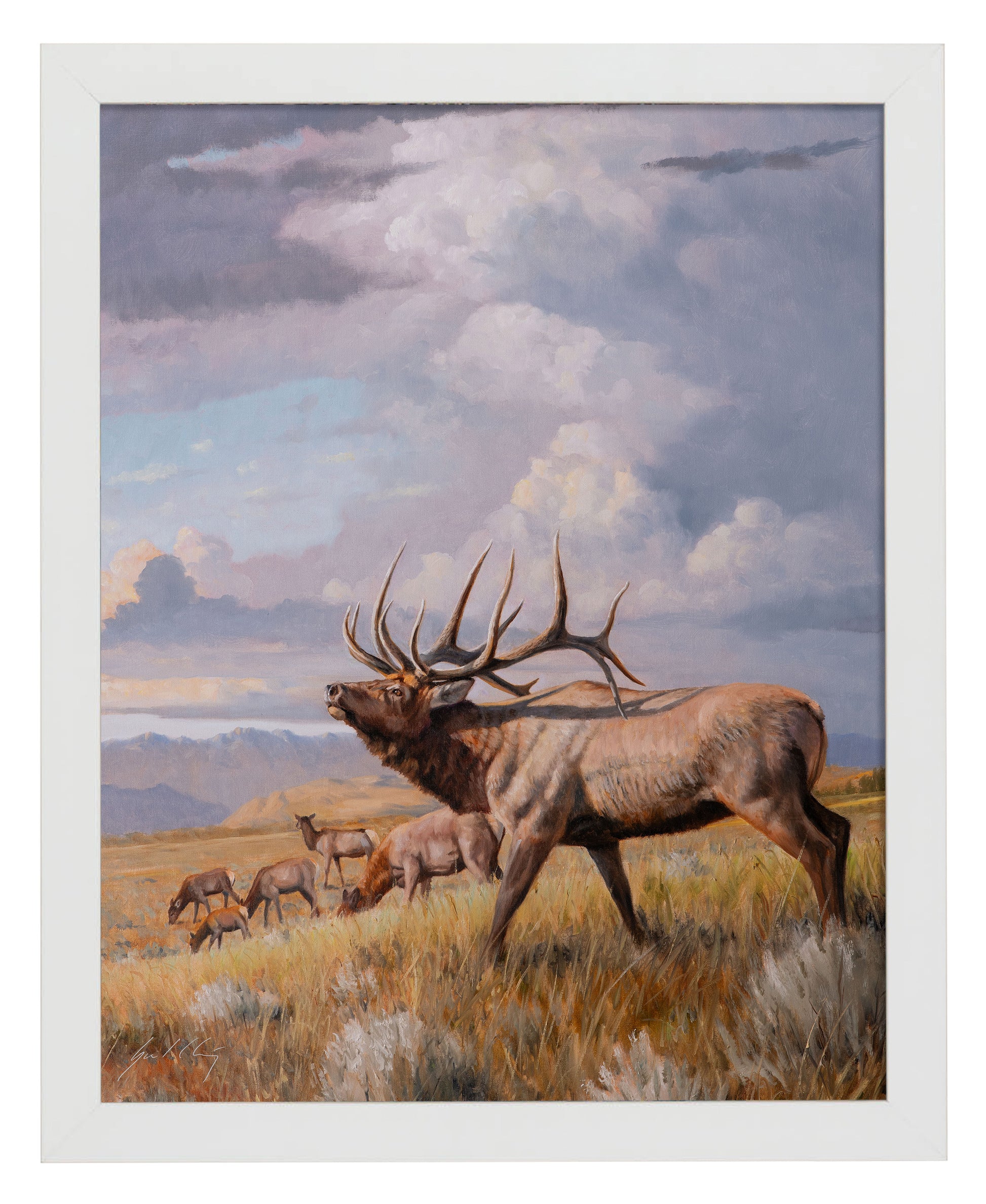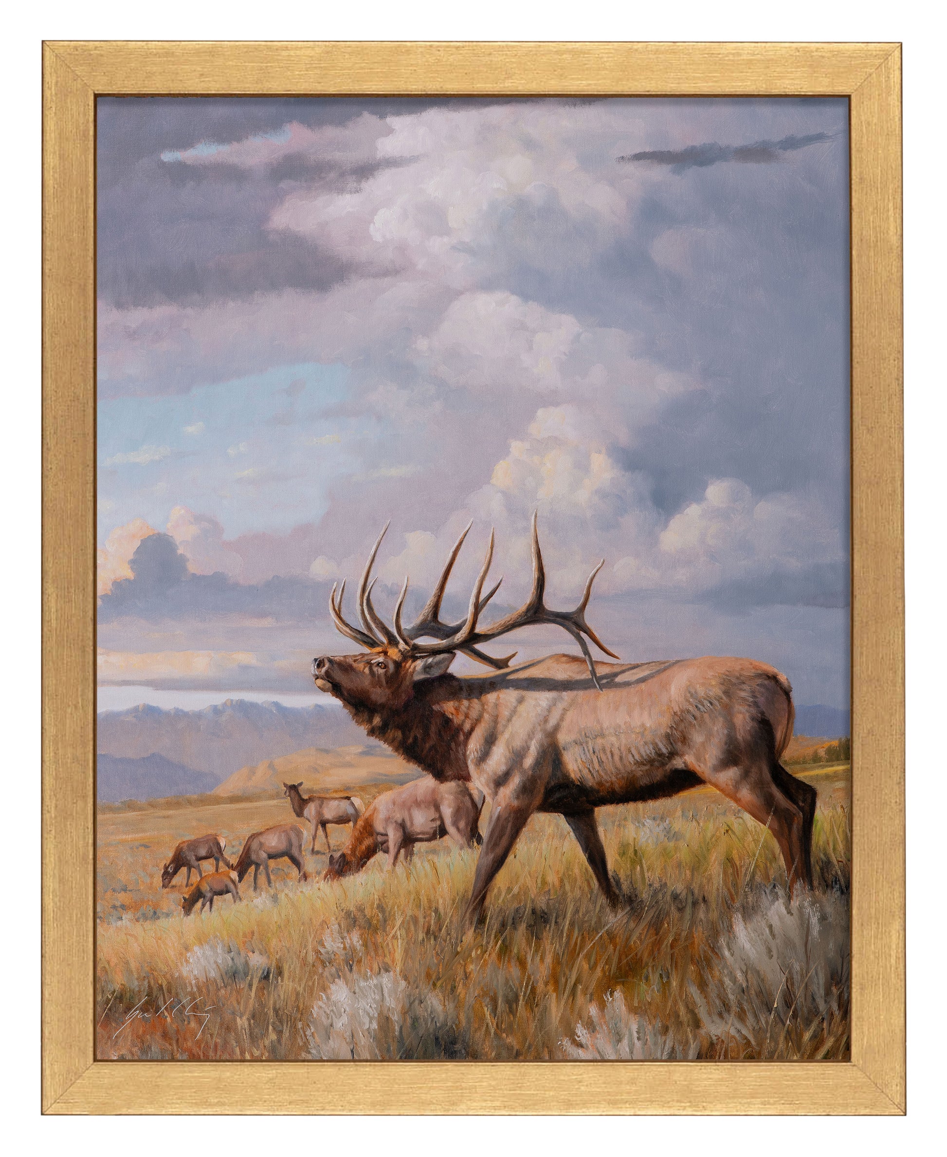 This is a painting I did because of the frame. I found this frame in an antique store. It is a Guido frame made by Gido Framers of Boston. I am a frame junky and there is nothing like a good frame to inspire me to paint. I immediately saw an opportunity to show the wide-open vista of the West. I wanted to capture the landscape as well as the dominant bull elk.
