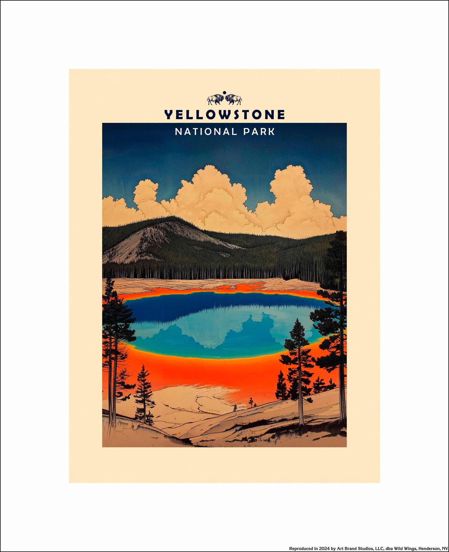 This vintage-style travel poster art depicts an iconic scene from Yellowstone National Park. The image showcases the vibrant, multicolored Grand Prismatic Spring, one of the park's most famous geothermal features. The spring's vivid blue center is surrounded by bands of orange, red, and yellow, accurately representing its real-life appearance. The composition is framed by silhouettes of pine trees, emphasizing the natural setting. Above the spring, billowing clouds dominate a deep blue sky, creating a dramatic backdrop. The mountainous terrain in the background adds depth to the scene. The artwork employs a limited color palette and simplified shapes, characteristic of mid-20th century travel poster aesthetics.