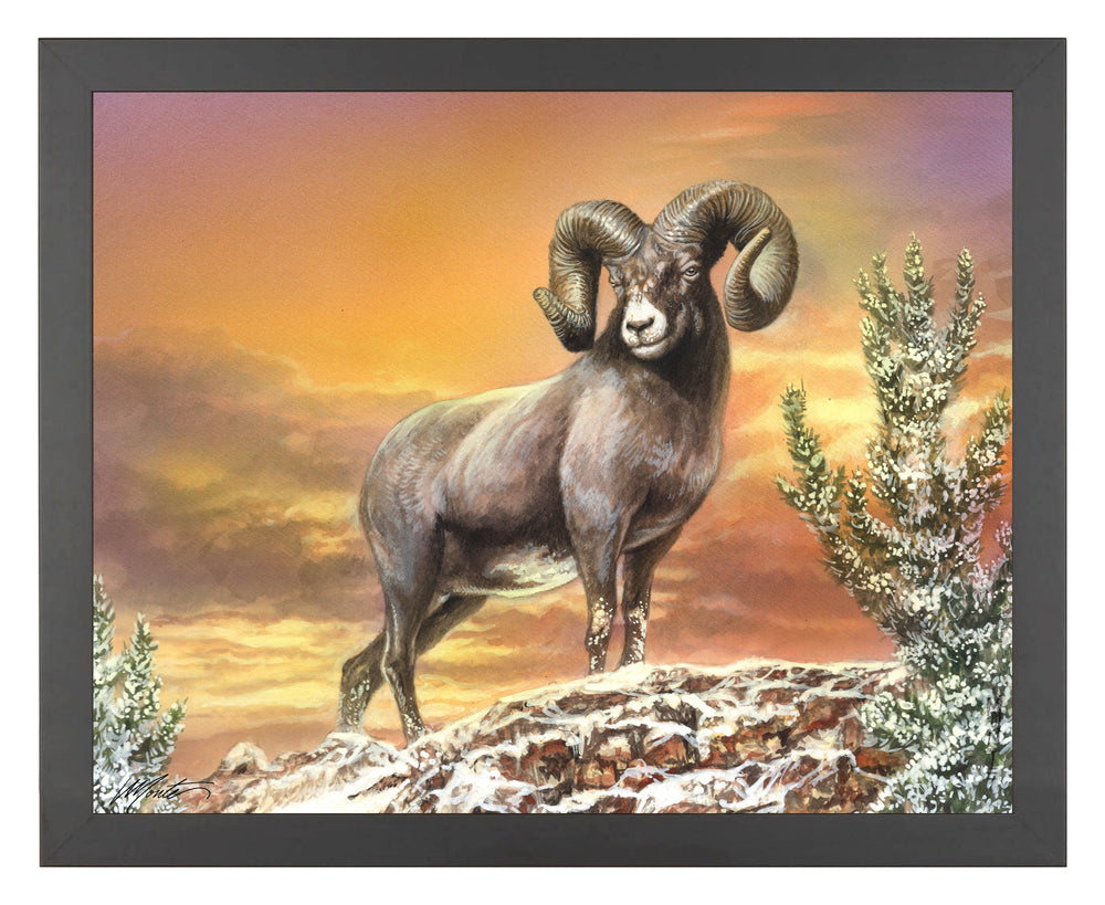 As the undisputed King of the Rockies, this Ram stands majestically surveying all the wonder laid out before him. Created by Monte M. Moore, this mixed media watercolor was created by this Colorado State University alumni as as tribute to the CSU Rams where Monte attained his Bachelor of Fine Arts.