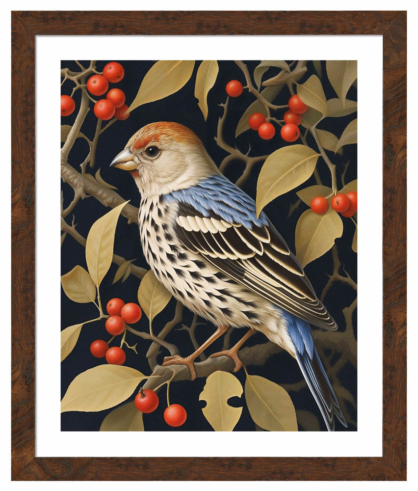 Autumn Sentinel - Finch Amongst Berries is a charming addition to the Backyard Sanctuary Collection, capturing the serene beauty and vibrant colors of a finch perched amidst a bounty of berries and leaves. The finch, with its delicate feather patterns and soft hues of blue and brown, stands out vividly against the dark, contrasting background, creating a striking visual harmony.