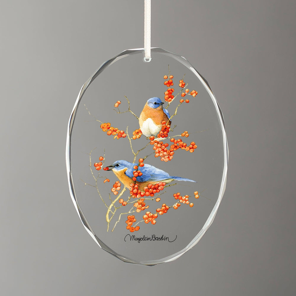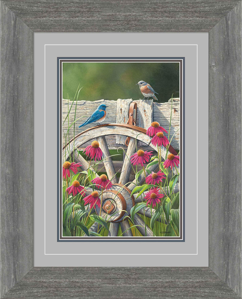 This charming miniature depicts a 'teenaged' bluebird brood days before they are on their own. Father is not sure who to feed.
