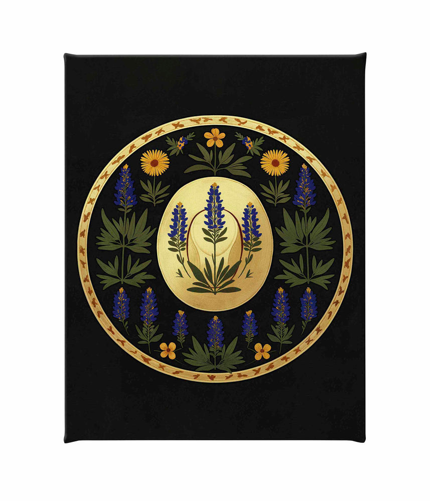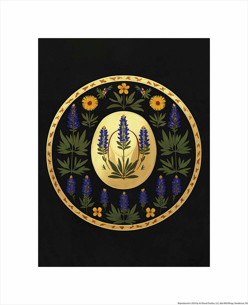 "Bluebonnet Brimmer" is a captivating work that marries traditional motifs with a celebration of regional flora. The composition centers around a circular design, reminiscent of a decorative plate or medallion, with a cowboy hat symbol at its core, encircled by vibrant bluebonnets—Texas' state flower. This imagery is framed by a golden border adorned with delicate patterns, evoking a sense of heritage and craftsmanship.