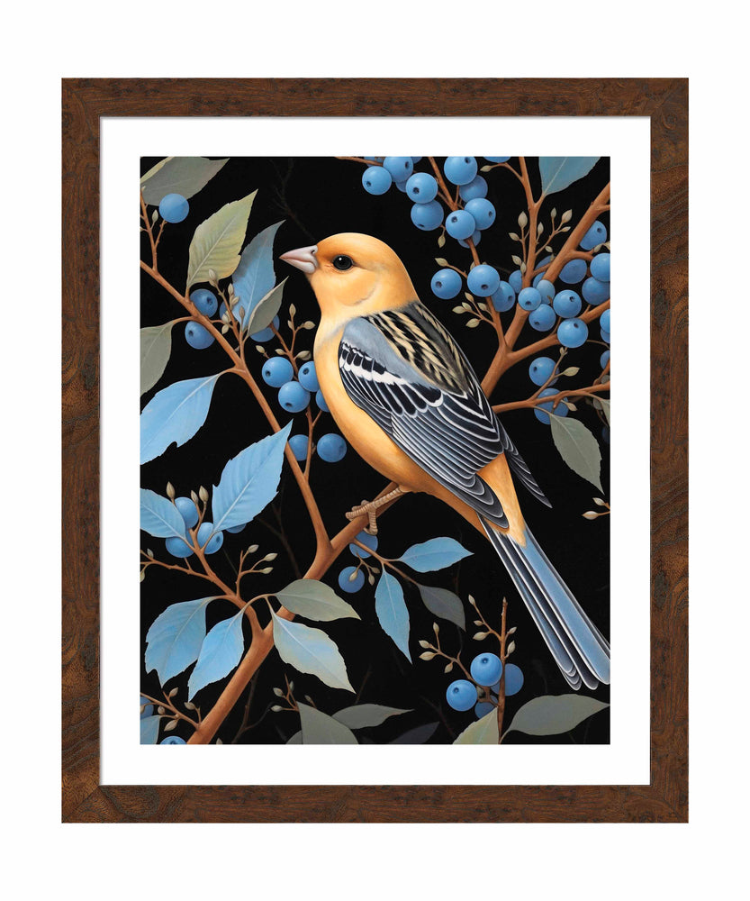 Bounty of Blue - Oriole Amidst Berries is a captivating piece from the Backyard Sanctuary Collection, depicting a vibrant oriole perched gracefully amidst a lush array of blue berries and foliage. The oriole's bright yellow and black plumage stands out beautifully against the deep blue berries and the contrasting dark background, creating a visually striking composition.