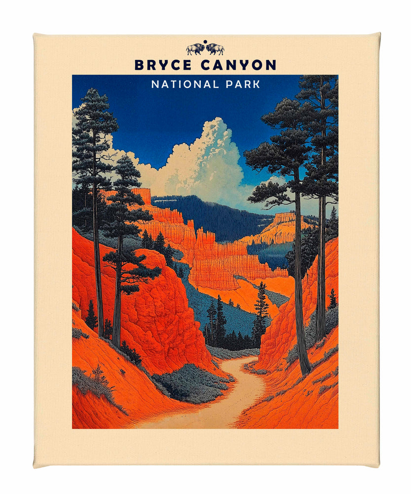 This vintage-style poster art brilliantly captures the essence of Bryce Canyon National Park. The image showcases the park's famous hoodoos - tall, thin spires of rock - rendered in vivid orange and red hues that accurately represent the area's distinctive sandstone formations. The composition is framed by tall pine trees, creating a natural window that draws the viewer's eye into the canyon. A winding trail leads through the center of the image, inviting the viewer to imagine exploring the park. The contrast between the warm, sunlit rock formations and the cool blue shadows adds depth and dimension to the scene. In the background, forested hills and a dramatic cloud formation complete the landscape, emphasizing the park's diverse terrain.
