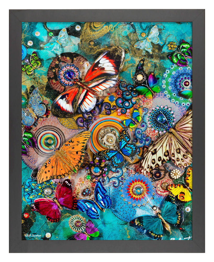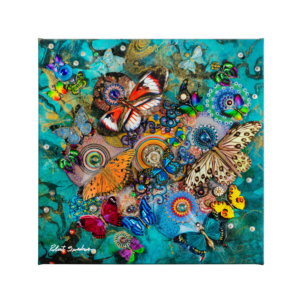 Butterflies From Across The Sea is an enchanting mixed-media fine art collage that I, Robert Swedroe, have passionately brought to life. This piece celebrates the world's aquatic beauty, adorned with colorful glass and paper butterflies from different countries. The collage's water-like aquatic background, created using paint, glitter, and resin, serves as a mesmerizing stage for the diverse and vibrant winged creatures. I enhanced the artwork further by adding glass beads, pearls, and geometrically designed circles, resulting in a collage full of aquatic tones and a fluttering symphony of colorful butterflies. Butterflies From Across The Sea explores color and movement, set against a serene water-like aquatic background. The play of light on the water's surface brings the artwork a sense of life and vibrancy. Amidst the aquatic background, an assortment of glass and paper butterflies takes flight, symbolizing the diverse cultures and the beauty that spans across borders. Each butterfly glides gracefully across the water, creating a dance of colors and patterns that delights the eye. Glass beads are carefully scattered throughout the collage, representing the shimmering reflections on the water. They interact with the butterflies, adding a dynamic interplay of texture and light. Lustrous pearls are strategically placed, resembling hidden treasures found within the depths of the sea. They add an element of mystery and elegance, elevating the overall composition. Geometrically designed circles create a sense of harmony and structure, drawing attention to the focal points and creating a sense of visual flow. Butterflies From Across The Sea is a visual celebration of cultural diversity and the interconnectedness of humanity. The butterflies from different countries represent the beauty of varied cultures coming together in harmony, much like these colorful winged creatures from across the globe. The water-like aquatic background symbolizes the unifying force of water, which transcends borders and connects distant lands, just as waterways link diverse cultures worldwide. The collage serves as a reminder of the treasures that lie in our shared human experiences, symbolized by the pearls hidden beneath the water's surface. Butterflies From Across The Sea reflects my passion for art and architecture, where I merge various elements to create a visually enchanting mixed media fine art collage. Through the water-like aquatic background, the colorful glass and paper butterflies, glass beads, pearls, and geometrically designed circles, this artwork is a poetic symphony of aquatic tones and diverse winged creatures. This collage inspires viewers to embrace cultural diversity and appreciate the interconnectedness that binds us all as citizens of the world.