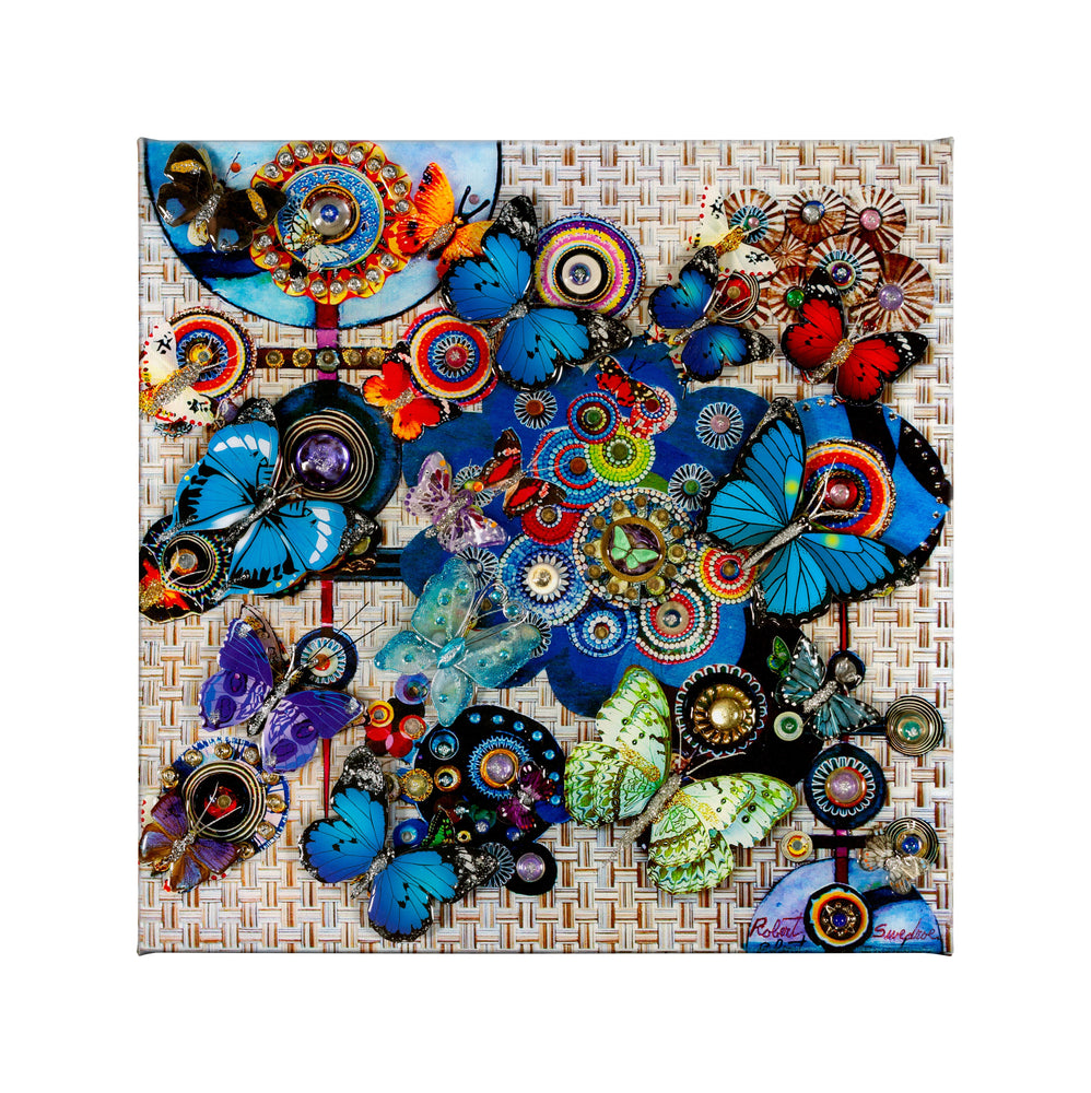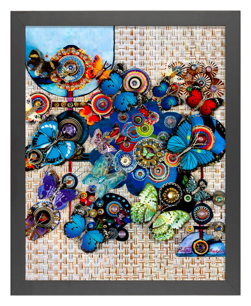 When it comes to creating collage art, I take a surreal approach and leave it up to the viewer to interpret what they see. My intention is to captivate the audience and encourage them to uncover something new every time they look at my work. One of my pieces, Butterfly Blues, is a celebration of my admiration for these magnificent creatures and the vibrancy they bring to our world during their brief existence. The original collage art features bright blue paper butterflies adorned with jewel-encrusted circles set against a basketweave placemat.
