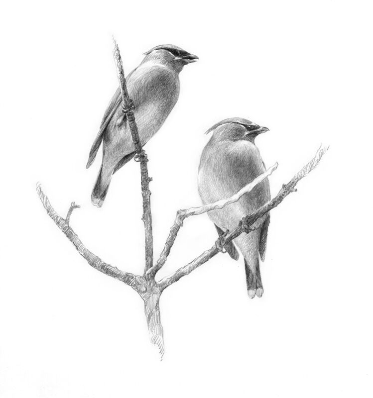 This drawing shares a close up view of a pair of cedar waxwings (birds) sitting on a branch.