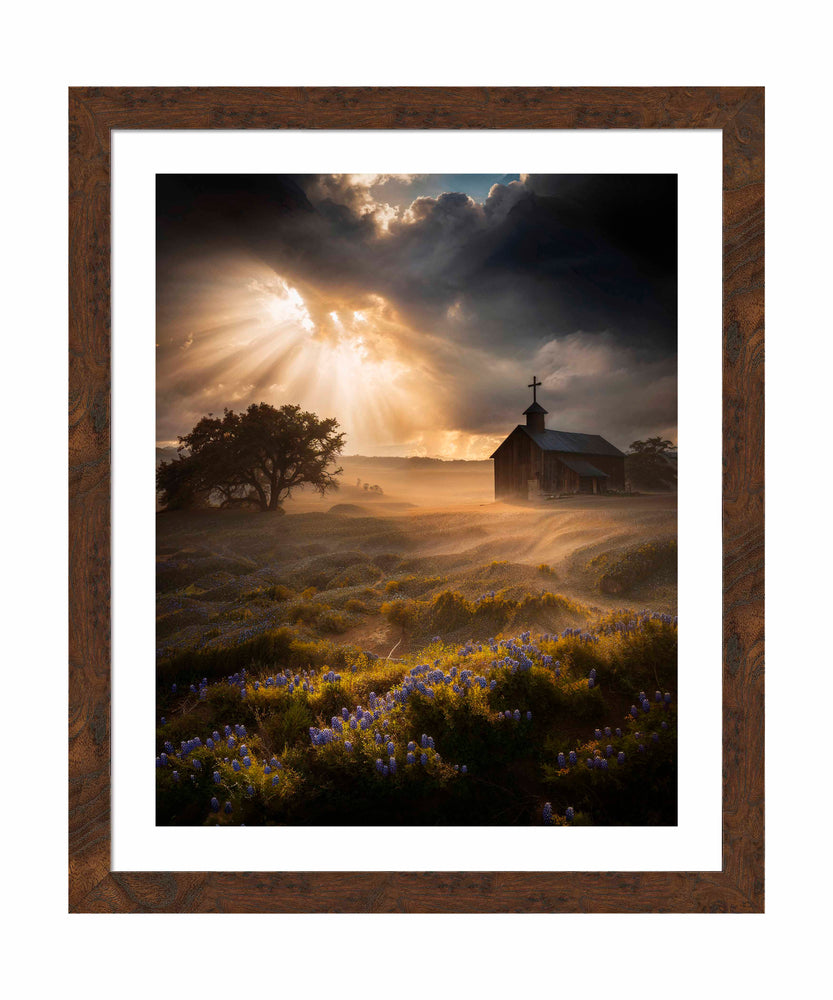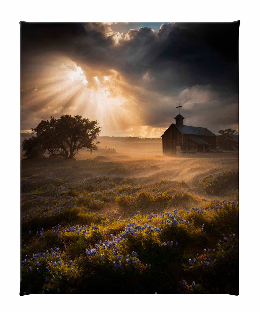 "Celestial Rays Over Lone Star Land II" is a poignant continuation of the exploration of divine light and serene landscapes, evoking a sense of peace and spiritual reflection. The painting centers on a solitary chapel, standing steadfast amidst a field of wildflowers, as the day's first light begins to break through a dense canopy of stormy clouds.