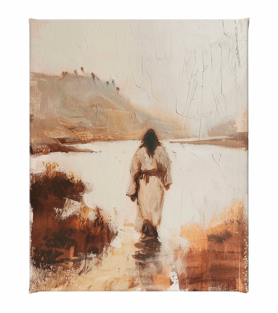 Christ in the Wilderness is a minimalistic yet profound portrayal of Jesus walking alone in a vast, desolate landscape. The painting uses a soft, neutral color palette with tones of beige, brown, and earthy whites, evoking the barren and quiet atmosphere of the wilderness. The figure of Christ, dressed in simple robes, walks forward with a contemplative posture, embodying solitude and reflection. The background is abstract and textured, with hints of distant hills and empty land, emphasizing the isolation of the scene.