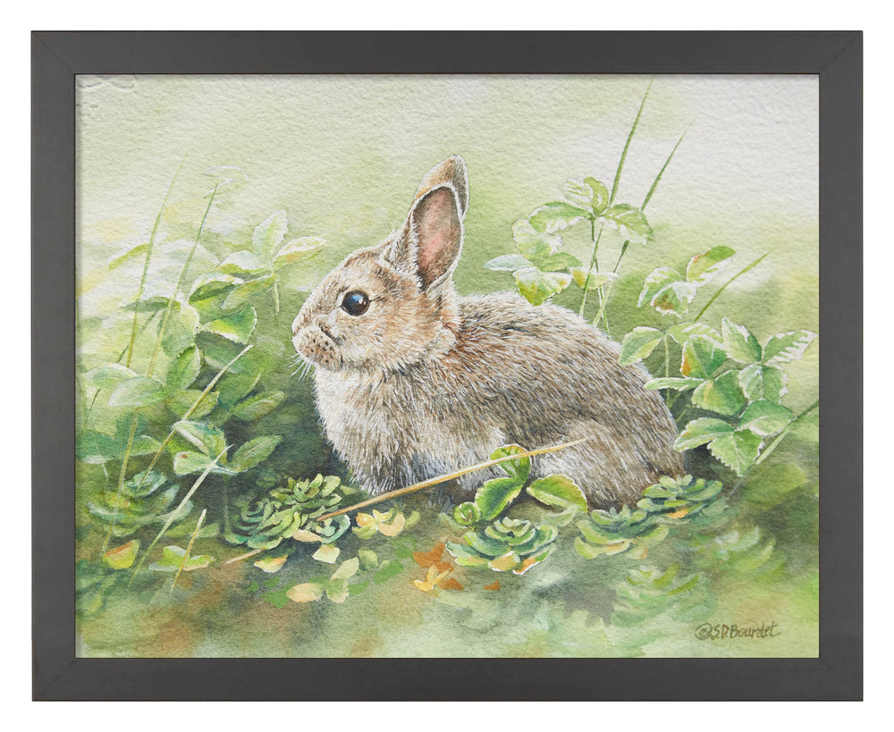The little rabbit is exploring the lawn in the spring sunshine. Painting the soft fur, I was challenged by the complexity off the coat with its many textures and soft shadings from buff to black.