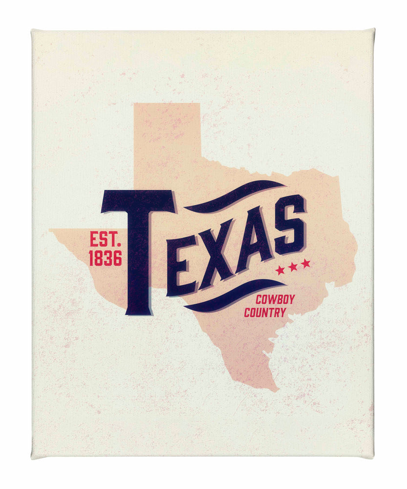 "Cowboy Country" is a bold and proud homage to the state of Texas and its deep-rooted cowboy culture. The composition features the unmistakable outline of Texas, anchored by strong typography and retro-inspired design elements. The word "TEXAS" dominates the piece, set in a rugged, Western-style font that evokes the strength and independence associated with the Lone Star State.