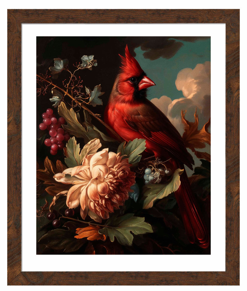 Crimson Majesty - Cardinal Amongst Blooms is an exquisite piece in the Dutch Floral Collection, masterfully blending the vibrant beauty of avian life with the delicate elegance of floral art. This painting showcases a magnificent Cardinal, perched regally amidst an array of lush foliage and blooming flowers. The Cardinal's striking red plumage contrasts beautifully with the rich greens and subtle hues of the surrounding flora, creating a captivating visual feast.