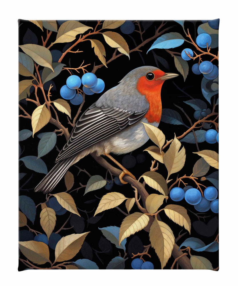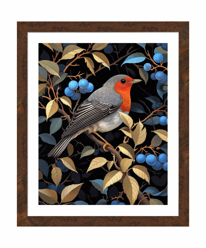 Crimson Song - Robin Among Blueberries is a captivating addition to the Backyard Sanctuary Collection, showcasing the vibrant beauty of a robin perched amidst a bounty of ripe blueberries. The robin's bright red breast and soft grey plumage stand out strikingly against the deep blue berries and the rich, dark background, creating a harmonious and visually appealing composition. The contrast between the warm tones of the bird and the cool hues of the berries and foliage adds depth and dimension to the scene, inviting viewers to appreciate the serene and colorful interplay of nature.