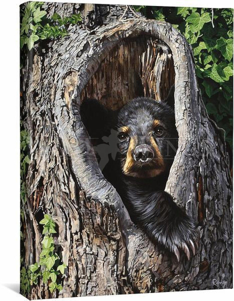 “Youthful explorations lead this black bear cub to a tight spot in a hollow tree, but he feels safe in his newly found ‘Cubby Hole’.”
