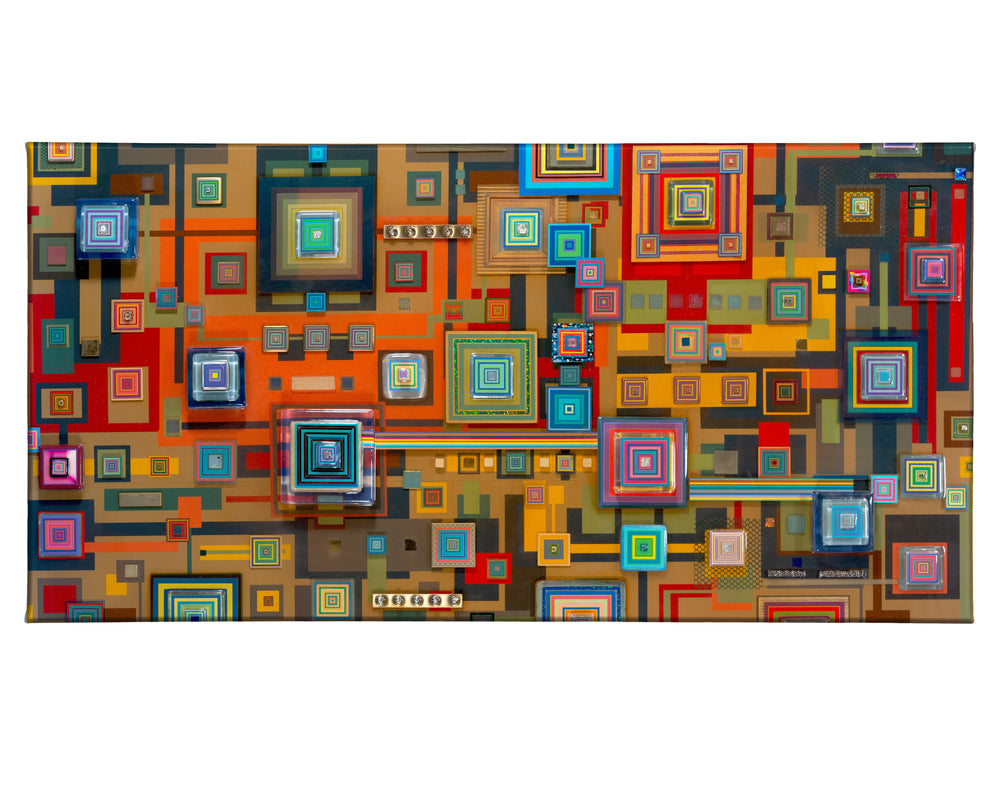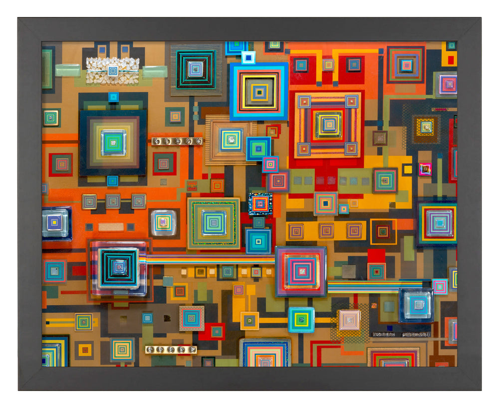 When creating my collage art, I take a surreal approach and avoid dictating what the viewer should see. Instead, I aim to draw them in and encourage them to discover new elements with each viewing. Cyber Flight features captivating blue hues and embellished butterflies, with a dragonfly hidden in this collage. Blue is one of my favorite colors, and this mixed-media collage on board and glass against a basketweave placemat created the texture for this winged creature and papillon playground.