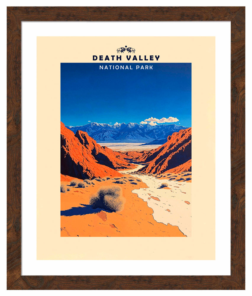 This vintage-style poster art of Death Valley National Park dramatically captures the stark beauty of America's lowest, driest, and hottest national park. The composition showcases a sweeping desert landscape, with vibrant orange-red canyon walls framing a winding, dry riverbed that leads the eye towards distant snow-capped mountains. The foreground features textured desert vegetation, adding depth and life to the seemingly barren landscape. The contrast between the sun-baked canyon and the cool, blue mountains on the horizon effectively conveys the park's extreme environment. A deep blue sky with wispy clouds tops the scene, emphasizing the vast openness of the desert. The artwork's use of bold, warm colors for the desert floor and cool blues for the sky and mountains creates a striking visual contrast typical of mid-20th century travel posters. This design powerfully communicates Death Valley's unique, otherworldly terrain, inviting viewers to experience its raw, desolate grandeur firsthand.