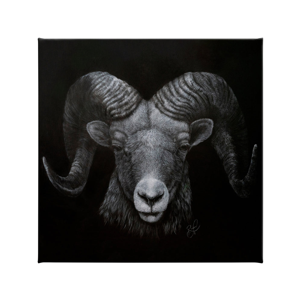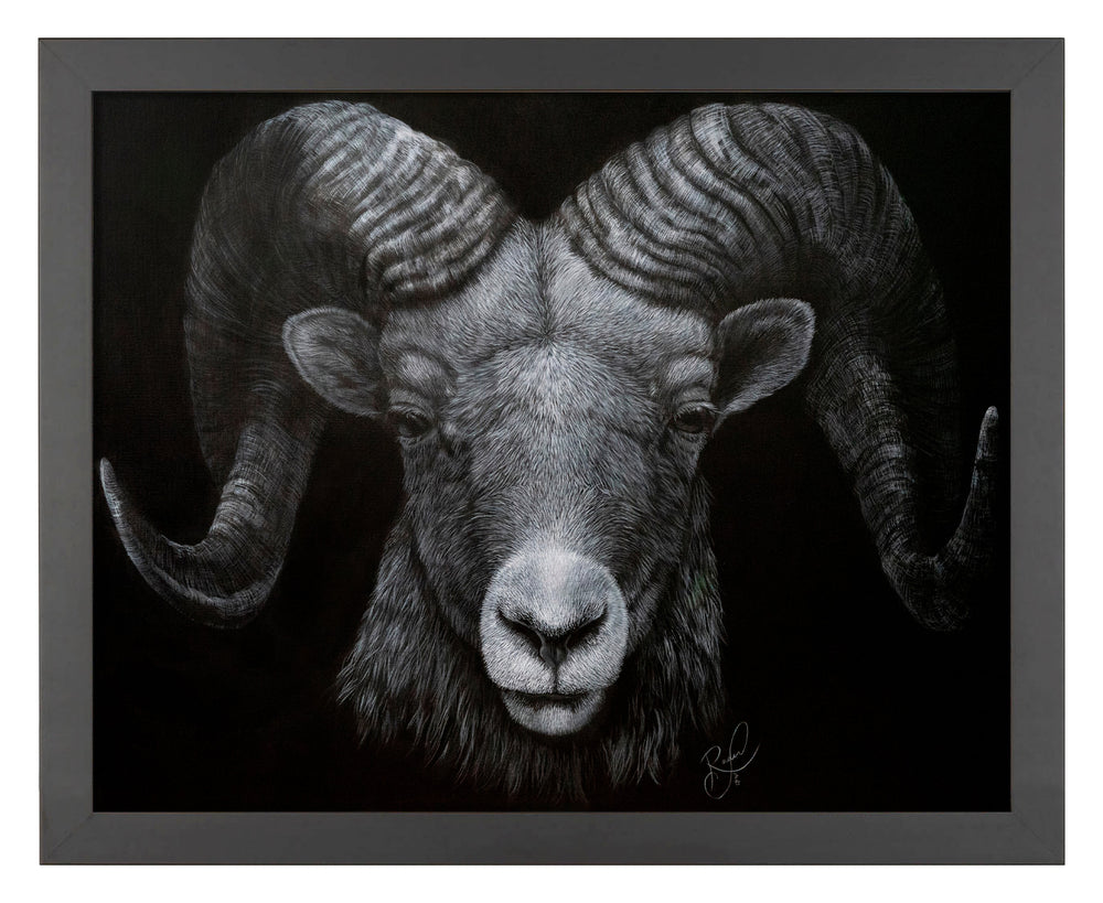 The bighorns are known for their head-to-head combat and the horn size is typically a symbol of its rank. This painting expresses a sense of status.