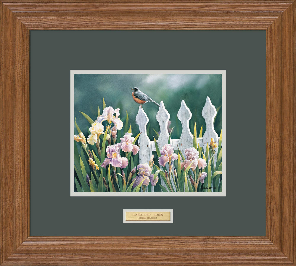 “Catching the first rays of sun, a robin perches on the picket fence, ready to sing his morning refrain. A flock of ruffled irises pays silent homage.”