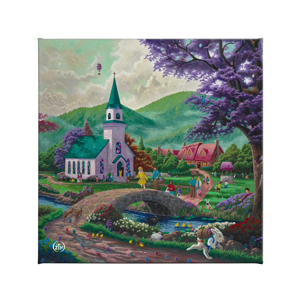 The joy of a holiday and its celebration can take many forms. Easter, forexample is a time of the Passion Play and reverence for the hoped-forreclamation of the human spirit. But it is also a time of good-natured fun andchild-like belief in magic. In my most recent work "Easter Sunday, " I try andcapture both cultural traditions. A small country church sits in a meadowwhere a community of the faithful has just let out; a morning of song andsermon well spent. Colored eggs are hidden for the children to hunt as theEaster Bunny scampers away. Have fun trying to find all 208 colored eggs Ihave hid in the landscape for your enjoyment.There are many Easter traditions, both sacred and silly. My hope is that yourejoice in all of them. And, as always, thank you for sharing my adventure in art!