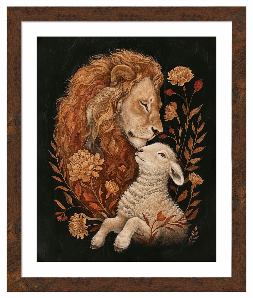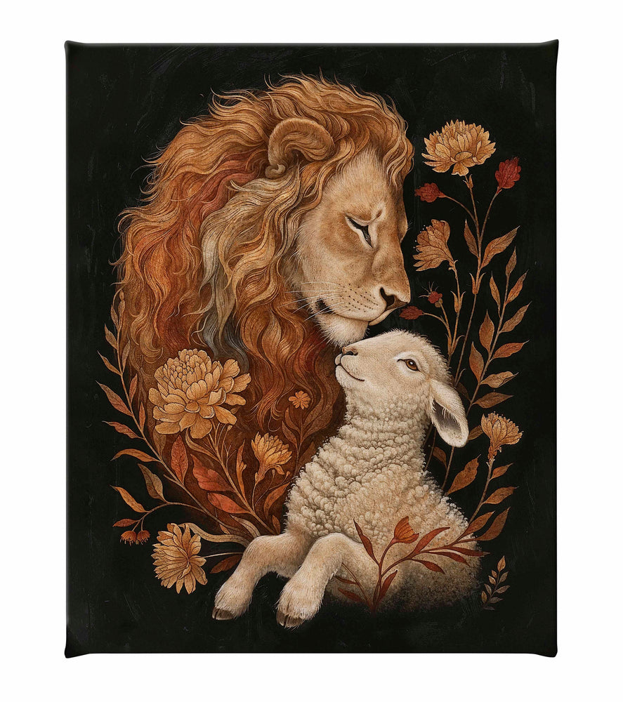 Eden Restored is a beautifully detailed painting depicting a tender and peaceful moment between a lion and a lamb, symbolizing harmony and unity. The lion, with its flowing golden mane, gently rests its head against the lamb, conveying a sense of protection and serenity.