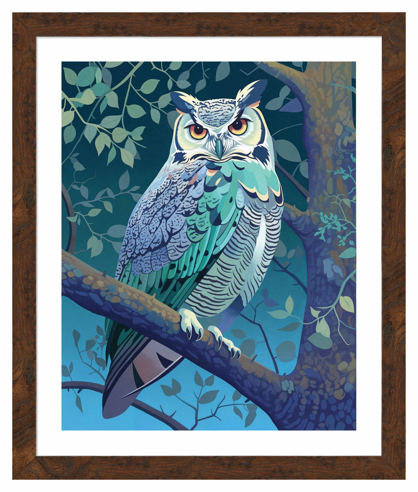 The artist's use of bold, saturated colors and intricate patterns brings the scene to life, creating a sense of depth and enchantment within the foliage. The dynamic interplay of light and shadow enhances the owl's regal stance, making it the focal point against the varied hues of the background. The rich, contrasting tones draw the viewer's eye, adding a sense of vibrancy and intrigue to the scene.