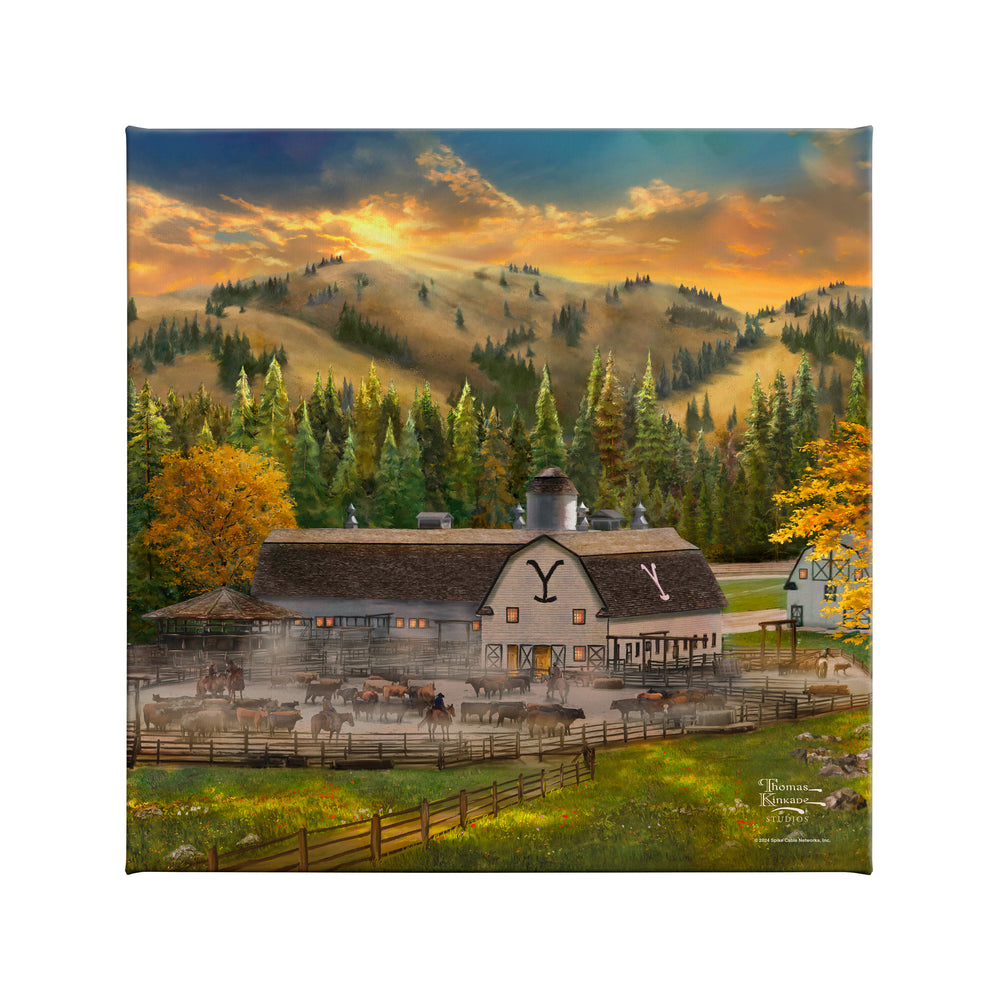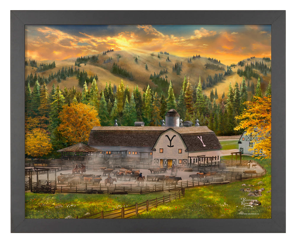 End of a Long Day, another evocative piece from the Yellowstone television series collection, showcases the iconic Dutton Ranch barn at dusk, with its distinctive 'Y' brand proudly displayed. The painting captures a peaceful moment as riders return from their daily work against a backdrop of Montana's rolling hills and autumn-touched landscape. The artist masterfully renders the fading light of day through a dramatic sky of turquoise and gold clouds, while the foreground depicts the ranch's working heart - its circular training corral, weathered fences, and the magnificent white barn standing sentinel over the property. The scene embodies the quiet dignity of ranch life that lies at the core of the Yellowstone saga, where each day ends with a return to the place that the Dutton family has called home for generations.