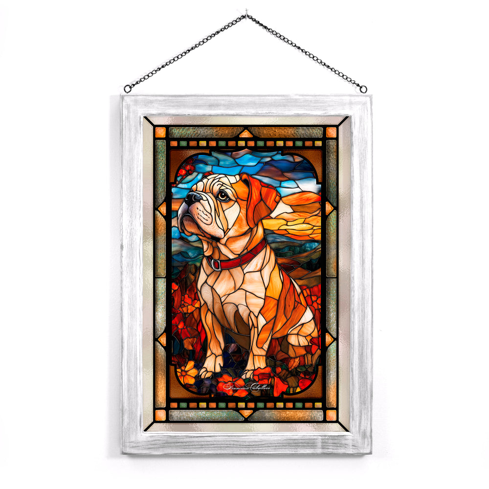"English Bulldog" captures the steadfast and endearing nature of this iconic breed through the intricate brilliance of stained glass artistry. The bulldog, with its distinctive features and soulful expression, sits proudly amidst a vibrant field of red and orange flowers, evoking warmth and resilience. The composition is illuminated by the golden hues of a setting sun against a serene backdrop of rolling hills and a vivid blue sky. Every detail, from the bulldog’s fur to the glowing floral elements, is meticulously crafted to celebrate the breed’s loyal and courageous spirit while blending it seamlessly with the beauty of nature.