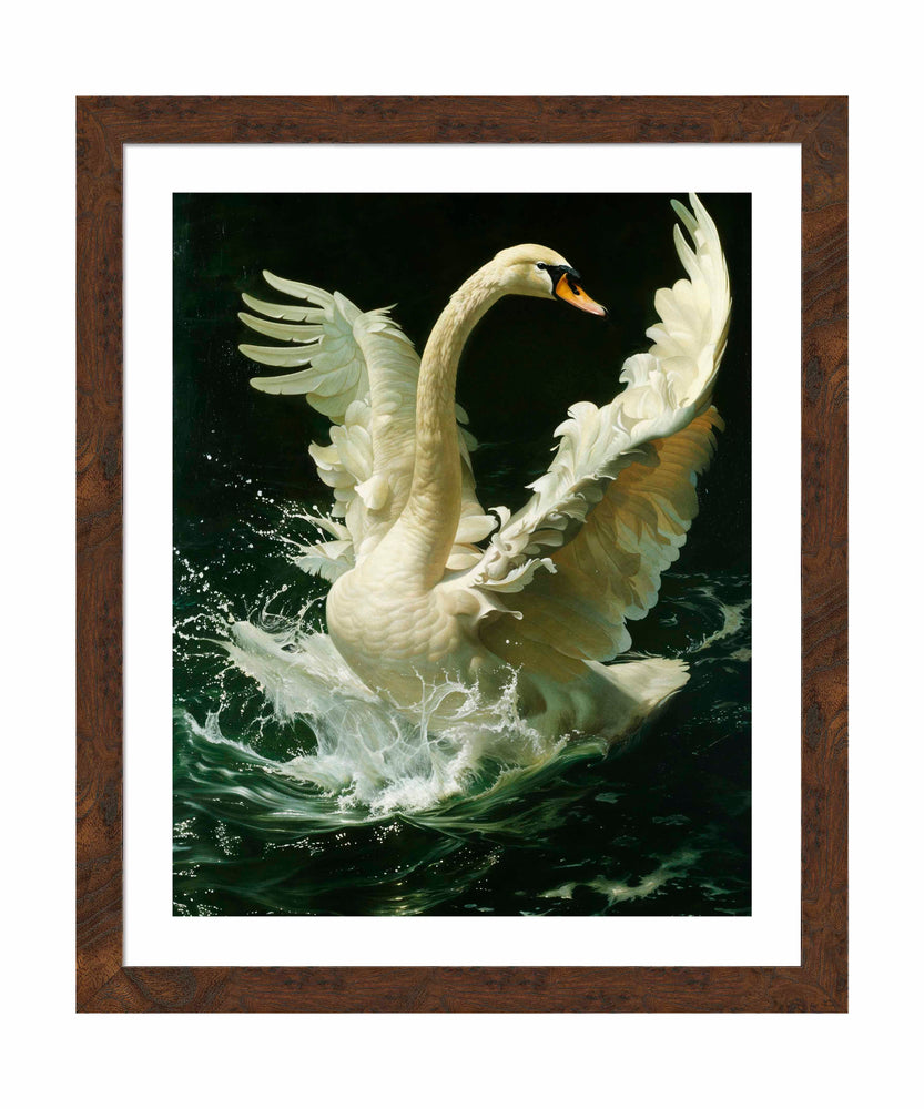 The artist's meticulous attention to detail is evident in the intricate rendering of the swan's feathers, each one delicately highlighted to capture the play of light and shadow. The dark, muted background serves to accentuate the brilliance of the swan's plumage, creating a dramatic contrast that draws the viewer's eye to the center of the composition. The dynamic motion of the water adds a sense of energy and life to the scene, enhancing the overall impact of the painting. Ethereal Majesty - Swan in Flight invites viewers to appreciate the serene beauty and dignified presence of the swan, celebrated through the lens of classical artistry.