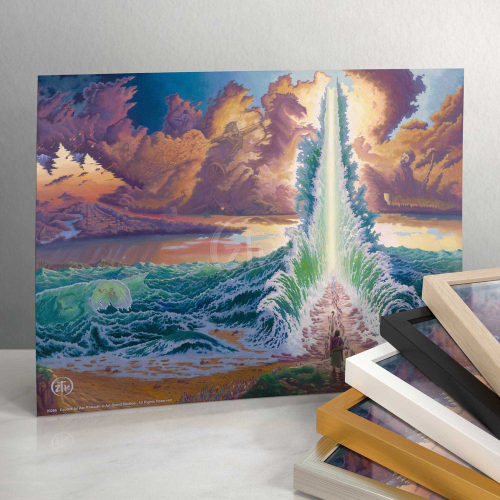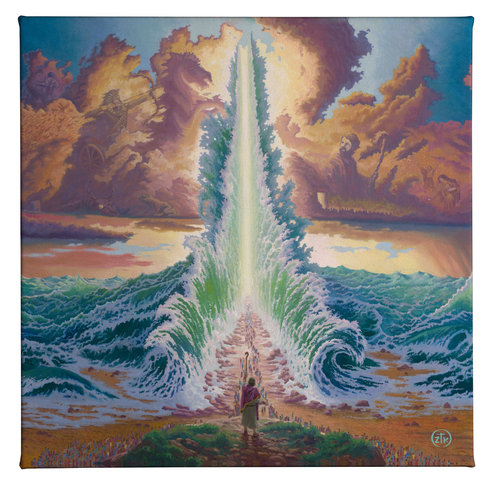 The story of Exodus is one of the most powerfully moving narratives in the Bible and, indeed, one of the most important readings in all of world culture. It touches on many of the most important themes of Judeo-Christian belief and gives them to the reader in a very dramatic and easily visualized manner. The importance of covenant, the promise of salvation, and the proof of an ever-present God are all revealed in this magnificent tale. It is my hope that through this painting these foundational ideas are made apparent and feed the spiritual growth of those who view it. It is also the case that I wanted to tell the story of Exodus in full. From the finding of a baby in a basket in the reeds along the shore of the Nile to the moment God provided his Commandments on Mount Sinai, the entire tale is told. Look to the turbulent waves and the rolling clouds and see the many scenes unfold. "Exodus" is the third painting in my Stories of the Bible I series. Look closely and you will find that I pay homage to my first two titles, "Noah" and "Jonah". The final painting in the group of four, "The Garden of Eden", is yet to come. I hope you all enjoy my efforts on and my vision for this image and, as always, I want to thank you all for sharing my adventure in art.