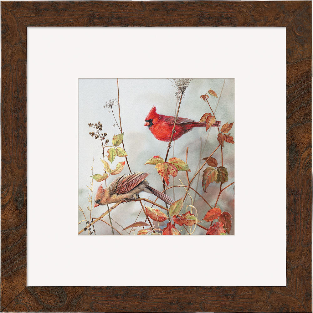 Cardinals and bright autumn blackberry leaves enliven a foggy morning.