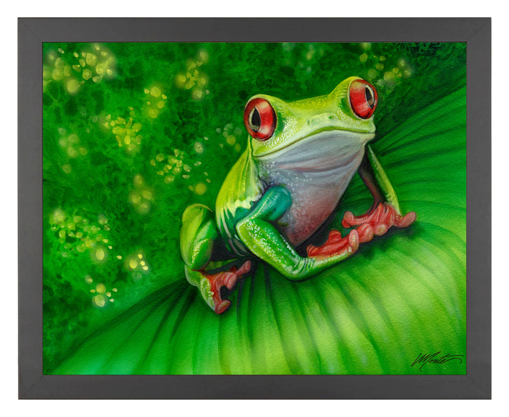 Tree frogs are a favorite fun and colorful subject for artist Monte M Moore whose depiction of this sticky toed denizen in watercolor is sure to put a smile on the face of any that gaze upon it!