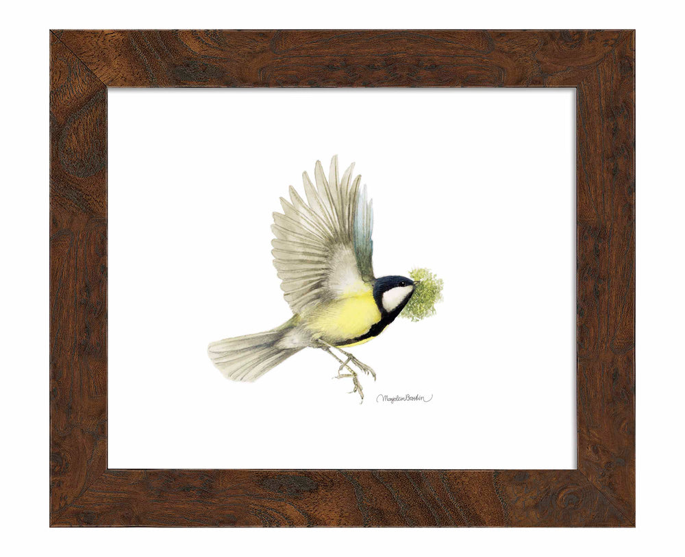 The Great tit has been building her nest for some time now. The male bird does little to help so she can decorate exactly to her own taste. Typical nesting materials are grasses, moss, animal hair and small feathers. As far as the location is concerned she prefers some kind of cavity, in an old tree, a nesting box or even a wall. She has been furnishing her nest with quite a lot of moss already, I bet this will be a comfortable nest!