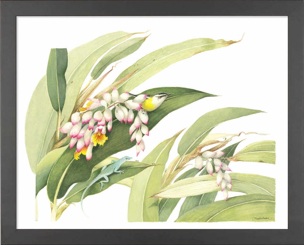 Every morning, when it's still quiet and calm, I take a walk in the tropical garden around the house. The ginger plants is flowering, these clusters look like they're made of plastic! The bananaquits steal nectar from the unopened flowers by making a small hole at the base of the bloom. And just like the bananaquits are enjoying the nectar, the ants love it as well. And in turn the heavenly blue Anole enjoys the ants...