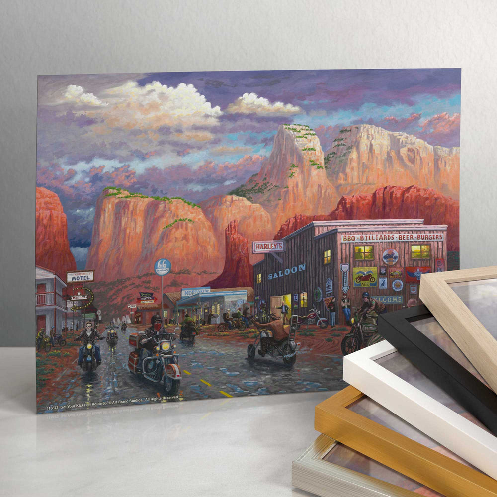 There is probably nothing more iconic in relation to American vacation plans than the idea of a “road trip”. And there is probably nothing more spiritually tied to that sojourner’s dream than Route 66, the “Main Street of America”. Indeed, the beauty of this country and the fun of its people are both to be found along this fabled ribbon of asphalt in addition to some “crazy by-way kitsch” that is the source of both memories and amusement. Join me as I begin this journey and travel this 2,500-mile thoroughfare from Chicago to Santa Monica stopping at many places along the way. In this first piece, I pay tribute to the motorcyclist and their modern-day iron horses. Look closely at the painting and you might recognize one of the film’s earliest two-wheeled rebels as well as a notorious easy rider. I have also placed references to some of the most noted makes of motorcycle for you to discover as you explore my canvas. My grandfather loved the lure of the open road, a feeling that was translated to my father and uncle and now to me and my own brothers. The joy of the ride is often as satisfying as the destination and so it is in this case. There will be several stops on this trip and further tributes to be paid. In the future, you will be invited to America’s drive-in theaters and diners and the great automotive traditions of this country will be explored. Finally, I will try to capture the best of the roadside attractions that so fundamentally define this motoring experience. Thank you all for coming and joining my adventure in art.