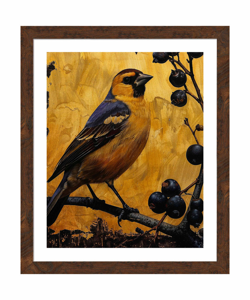 Gilded Harmony - Finch Among Berries showcases the delicate beauty of a finch set against a rich, golden backdrop. The painting features a finch, meticulously detailed to highlight the bird's intricate feather patterns and graceful stance. The warm, golden background enhances the finch's natural colors, creating a striking contrast that draws the viewer's eye. The artist's inclusion of dark berries and slender branches adds a touch of natural elegance to the scene, complementing the finch's vibrant presence.