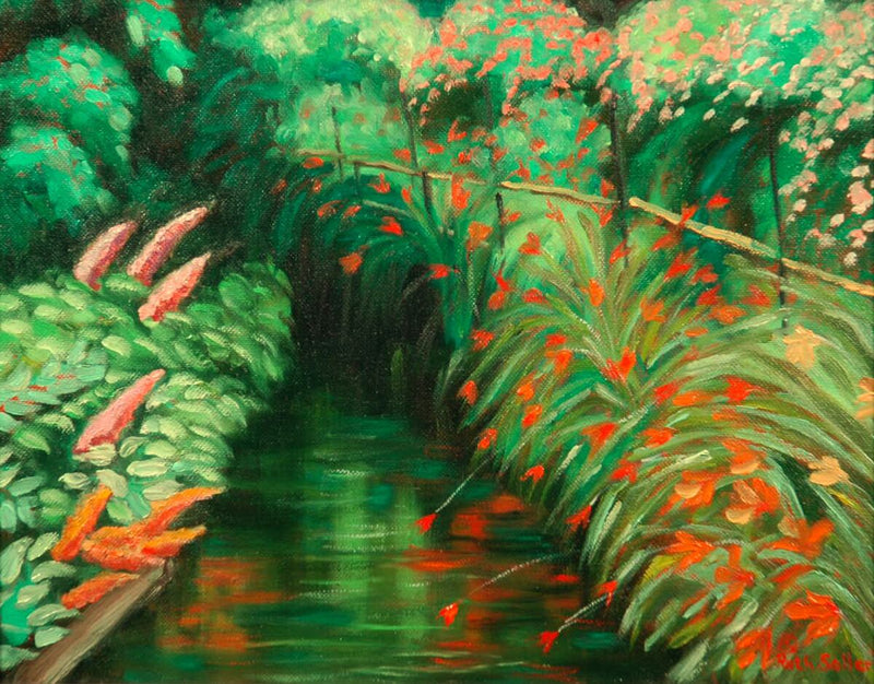 I focused on this intimate view from one of Monet's bridges with lush green foliage accented by brilliant pink, orange and red of the lilies leaning out over the dark waters below.