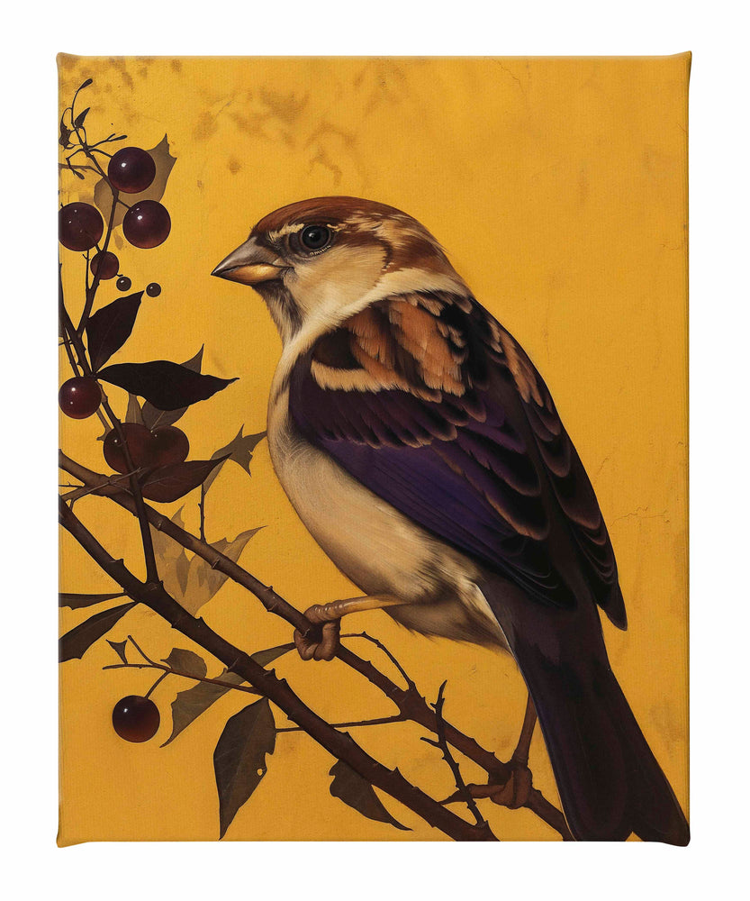 Golden Perch - Sparrow Among Dark Berries is a striking and elegant piece that showcases the serene beauty of a sparrow against a rich, golden backdrop. The painting features a delicate sparrow perched on a slender branch adorned with dark, ripe berries. The bird's plumage, with its warm browns and subtle purples, is meticulously detailed, highlighting the intricate patterns and textures of its feathers.