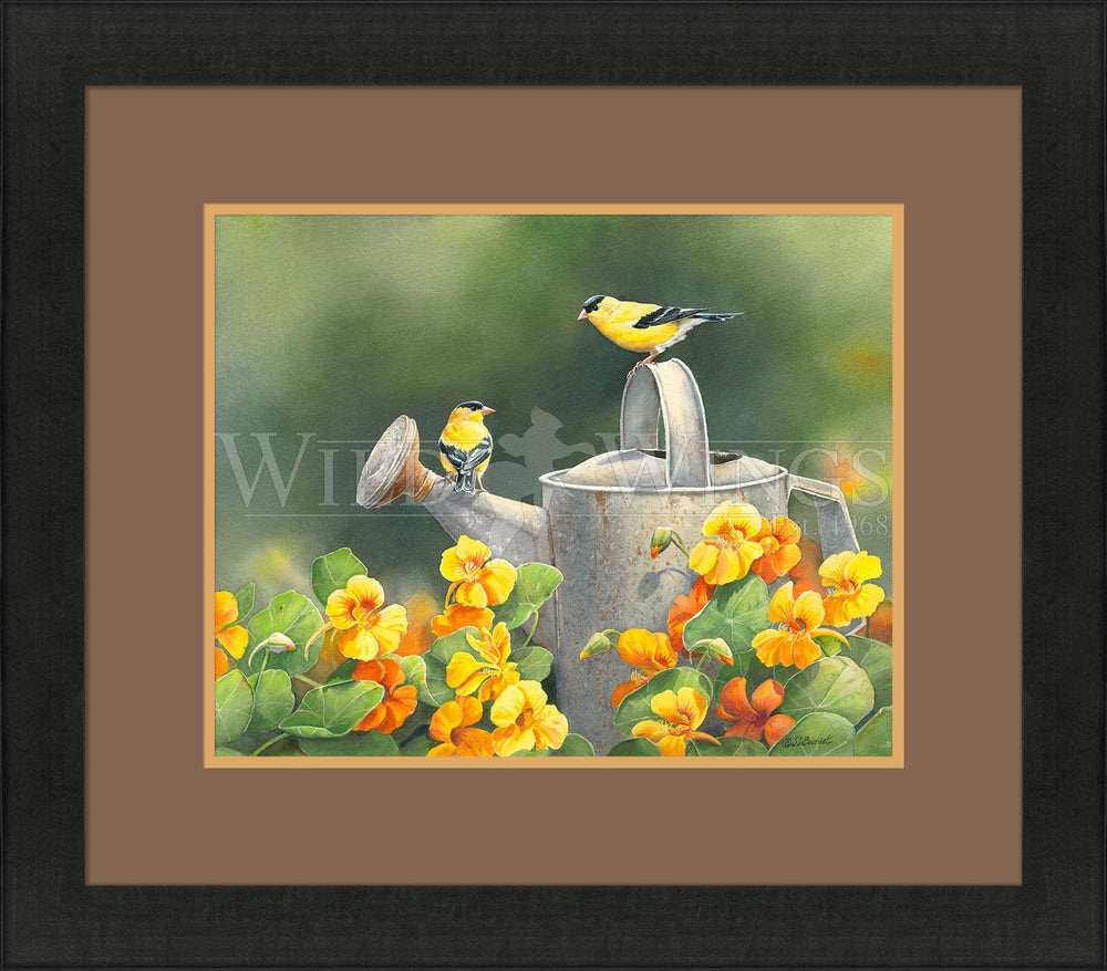 I’ve watered my garden with this old watering can for so many years that its bottom has rusted out. Now it’s a feature among my flowers and a perch for feathered friends.